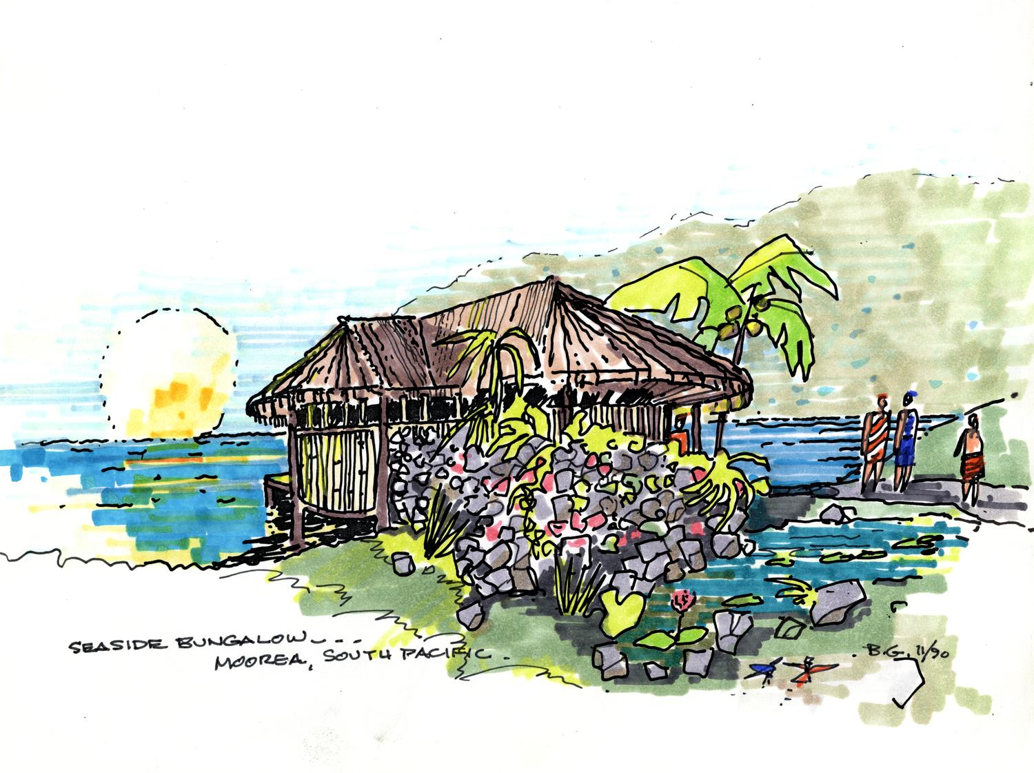 Color conceptual drawing of a bungalow for the Sheraton Hotel project on the island of Moorea, northwest of Tahiti.