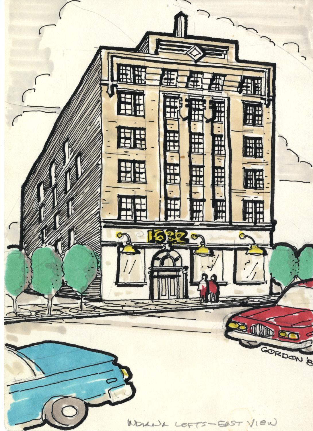 Full color architectural sketch of the Indiana Lofts project, showing an east view of the building. Dated 1981, 7"x5".