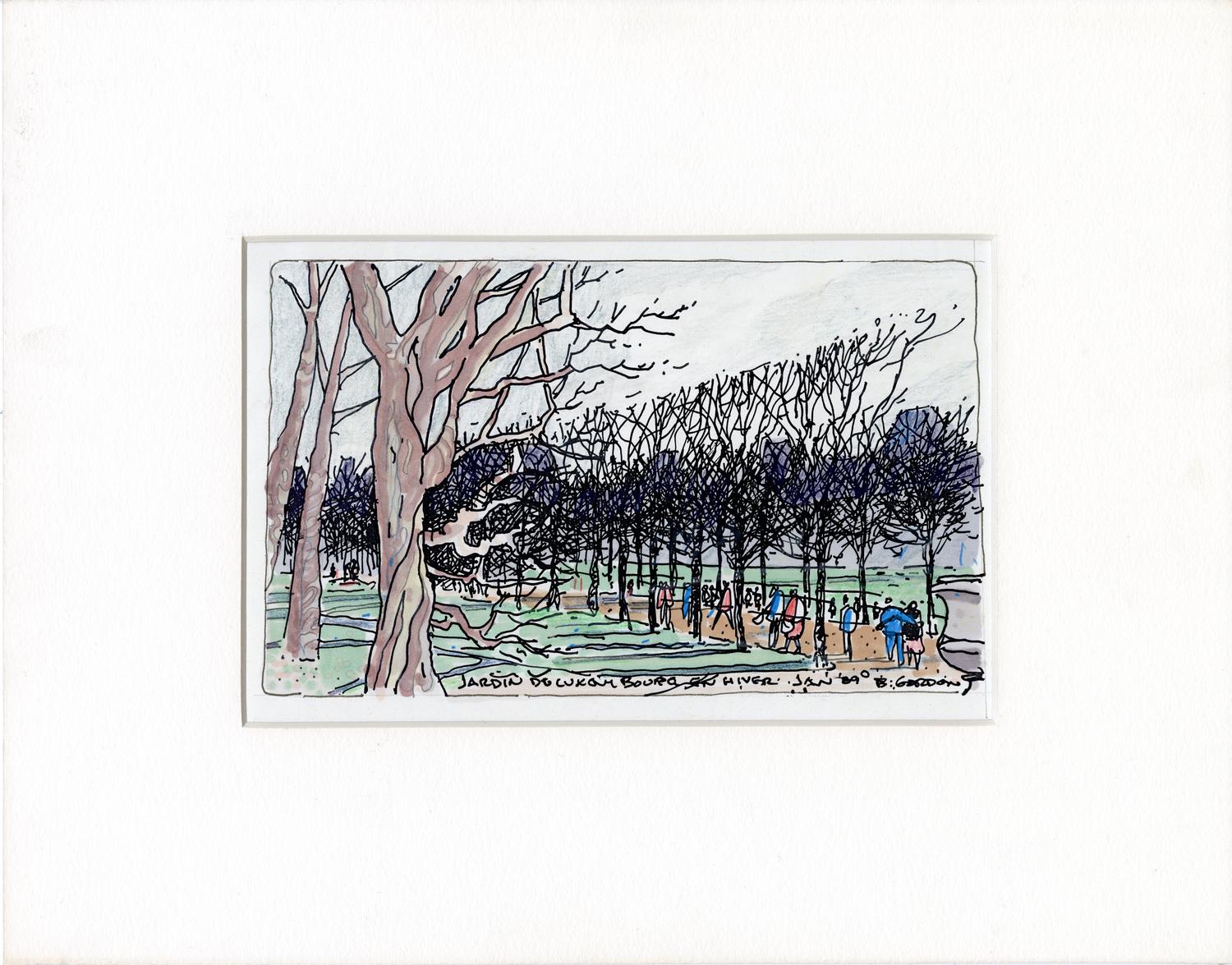 Hand-colored laser print of the Luxembourg Gardens in winter.