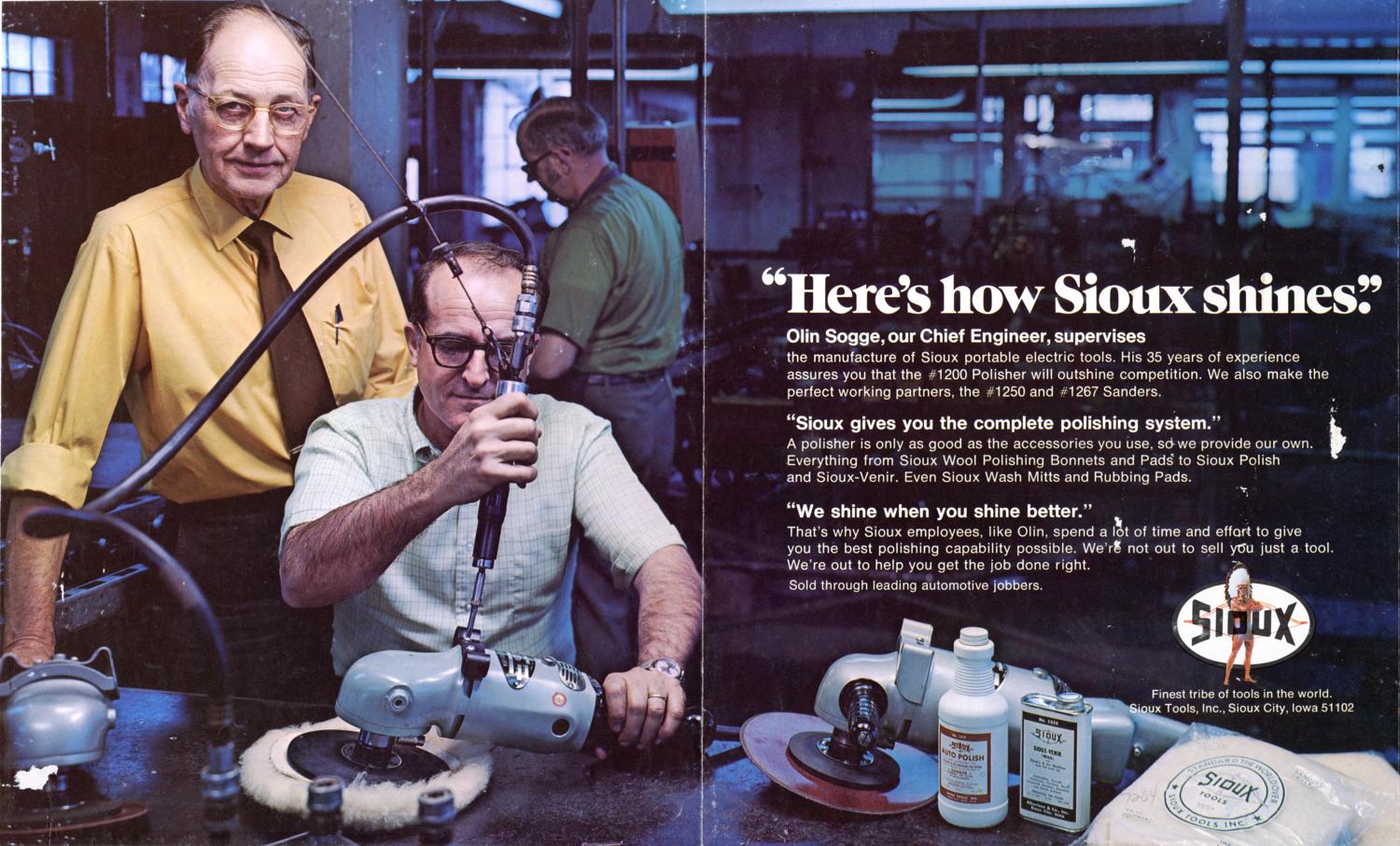 "Here's how Sioux shines" print advertisement created by photographer Howard LeVant/LeVant Photography (other contributors unknown) for Sioux Tools, Inc. Date of advertisement is unknown. Date range listed (1969-1978) is approximate. Title supplied by Howard LeVant.