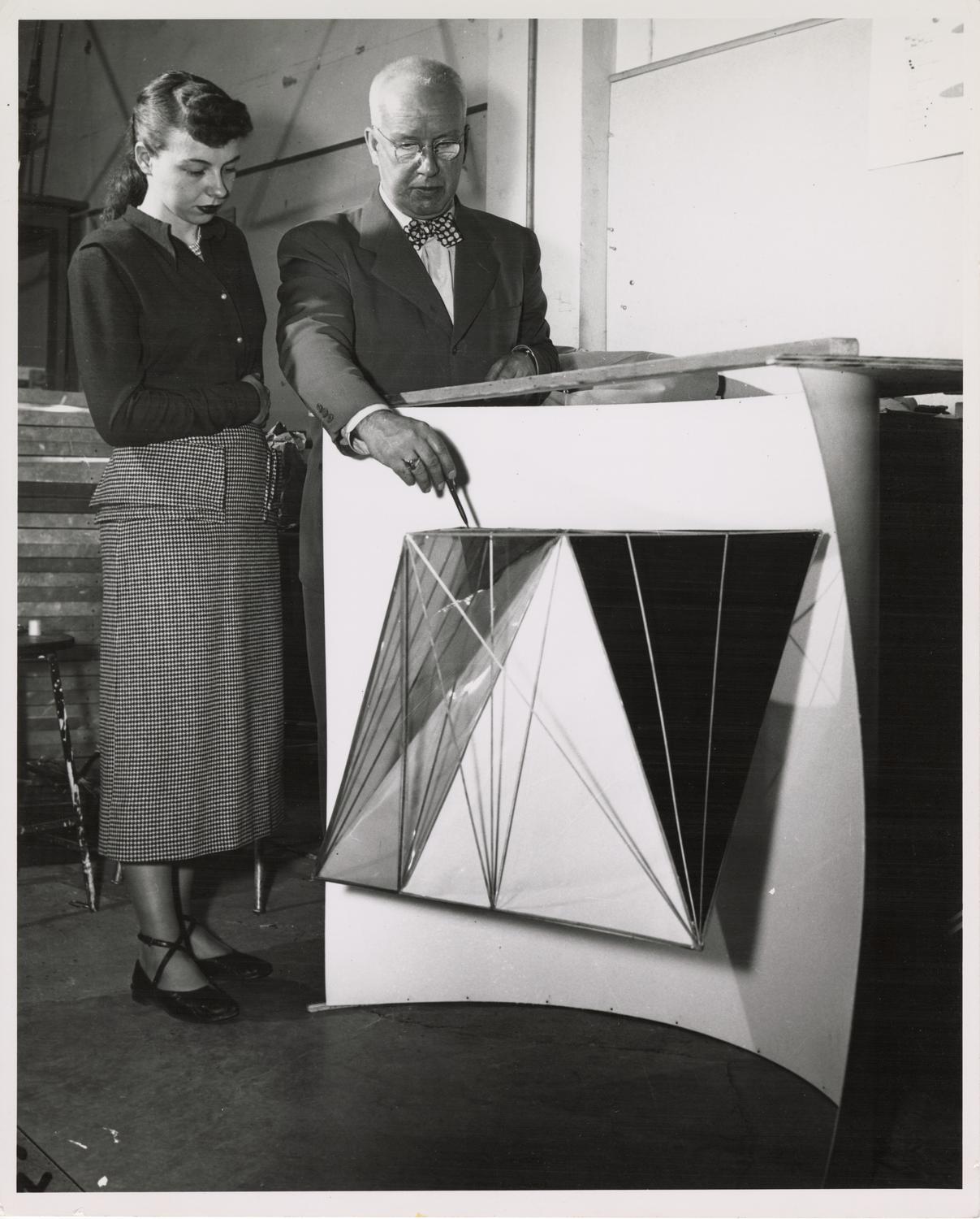Photograph of Buckminster Fuller with a student, identified on the rear of the photograph as Evelyn McCermiak (or McCermak). Photographer unknown. Date of photograph is unknown. Date range provided is an estimate based on Fuller's tenure at the Institute of Design.