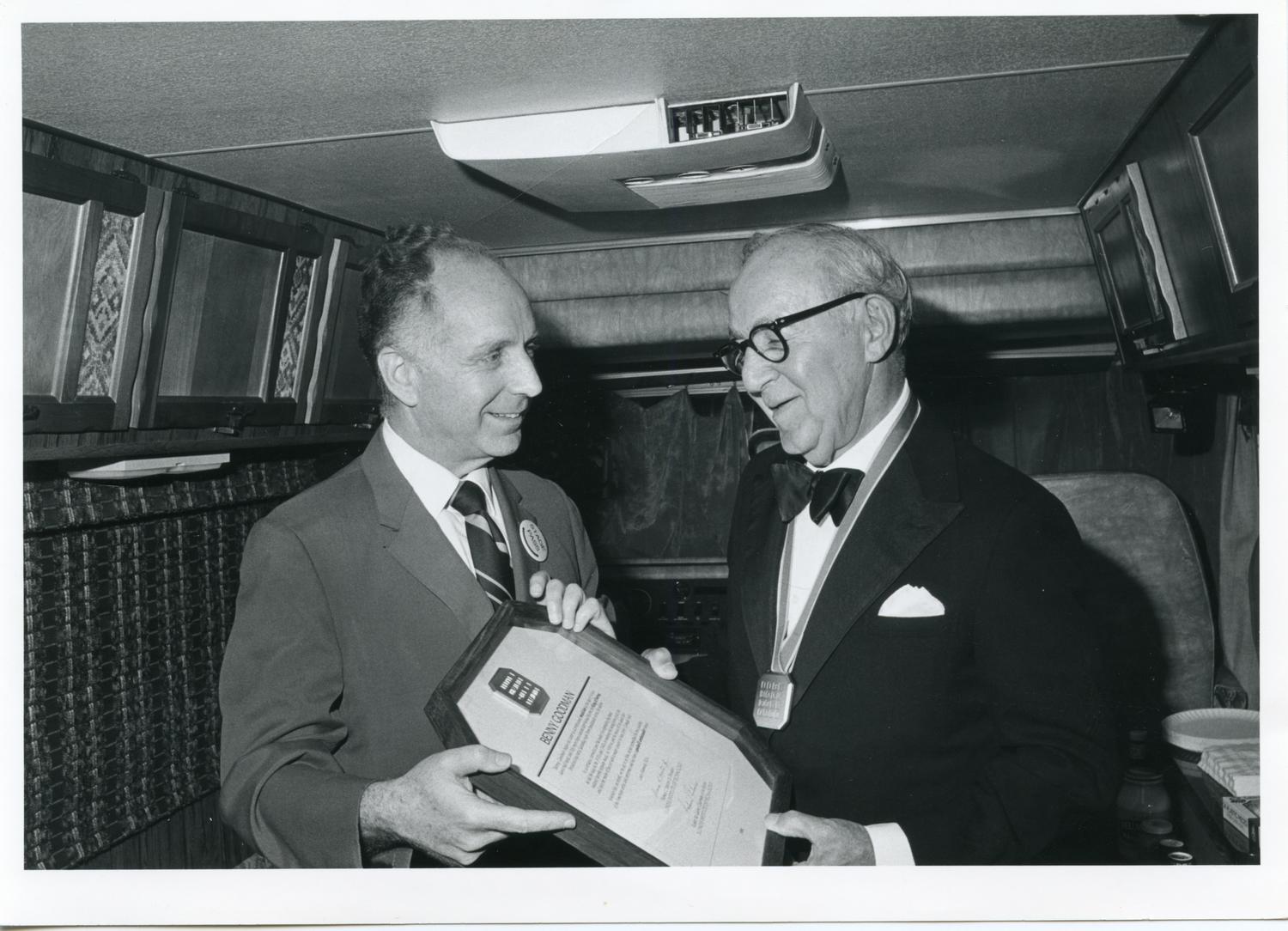Benny Goodman receiving the IIT Hall of Fame medal and plaque from IIT Provost Sidney Guralnick, Chicago, Illinois, ca. 1980