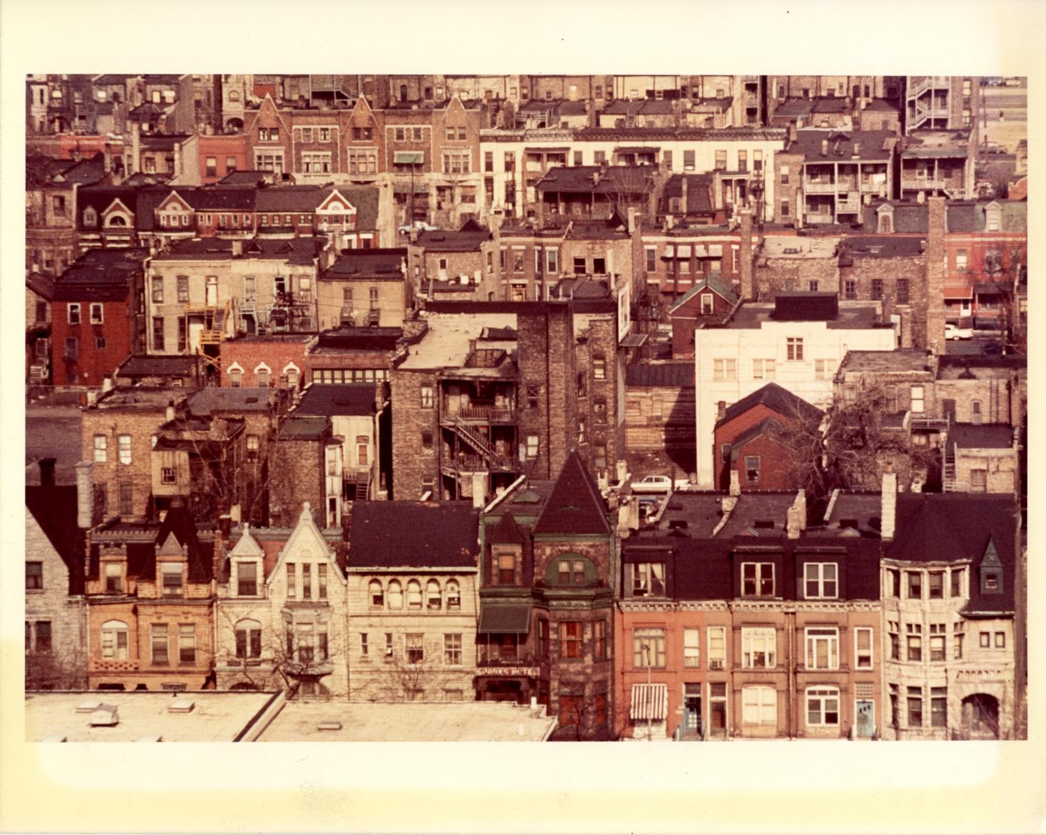 Color photograph depicting the Bronzeville neighborhood in 1961. Coverage includes the 3400 south blocks of Michigan Avenue, Indiana Avenue, Prairie Avenue, and Calumet Avenue in Chicago, Illinois.... Show moreColor photograph depicting the Bronzeville neighborhood in 1961. Coverage includes the 3400 south blocks of Michigan Avenue, Indiana Avenue, Prairie Avenue, and Calumet Avenue in Chicago, Illinois. One newer white commercial building at the left is the former Chicago Defender building. Photographer unknown. Show less