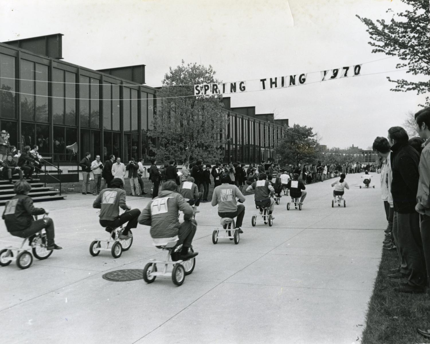 Photograph of the tricycle race during the 1970 Spring Thing. Spring Thing, sponsored by the Union Board, occurred during the fall semester, usually in October. The tricycle race, first held in... Show morePhotograph of the tricycle race during the 1970 Spring Thing. Spring Thing, sponsored by the Union Board, occurred during the fall semester, usually in October. The tricycle race, first held in 1968, was a highlight of the annual festivities. Photographer unknown. Show less