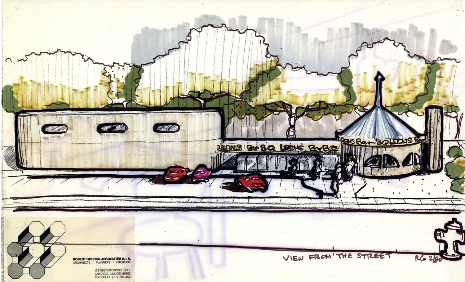 Full color architectural sketch of a location of the Leon's Bar-B-Q restaurant franchise.