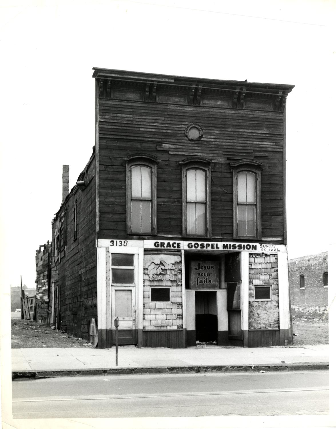 Photograph of the front of Grace Gospel Mission, 3138(?) South State Street. This storefront church was demolished ca. 1950. Date of photograph is unknown. Date range listed is approximate.