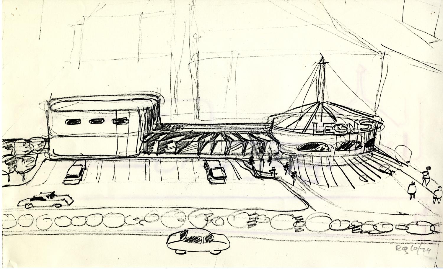 Architectural sketch of the exterior of a location of the Leon's Bar-B-Q restaurant franchise.