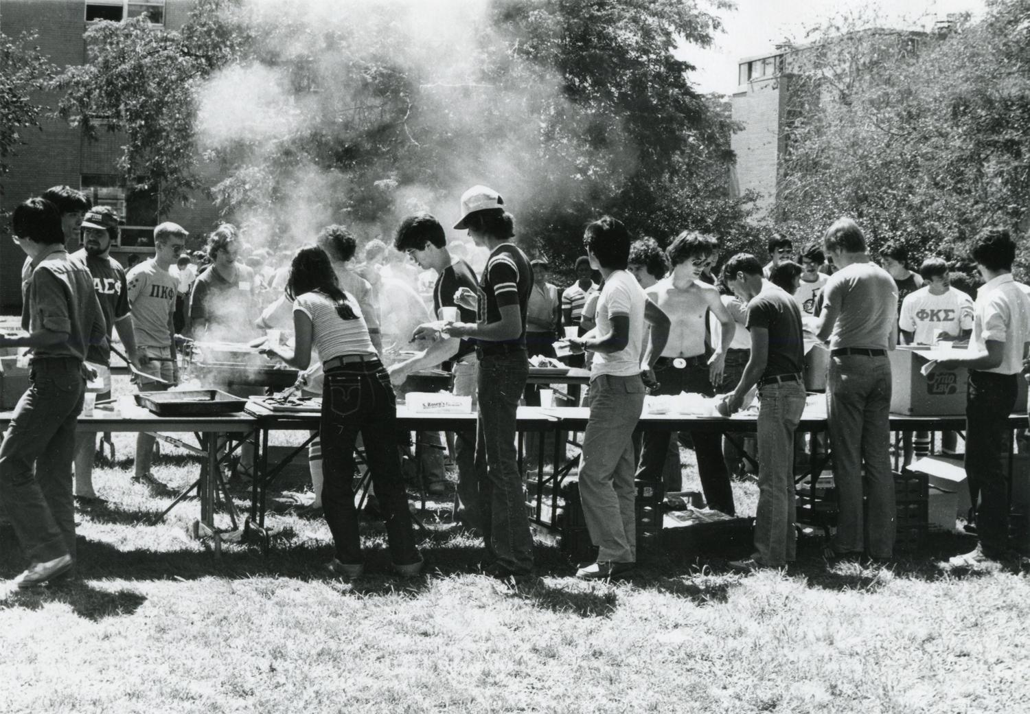 Photograph of students at a fraternity barbecue on the Illinois Tech campus in 1981. Photographer unknown.