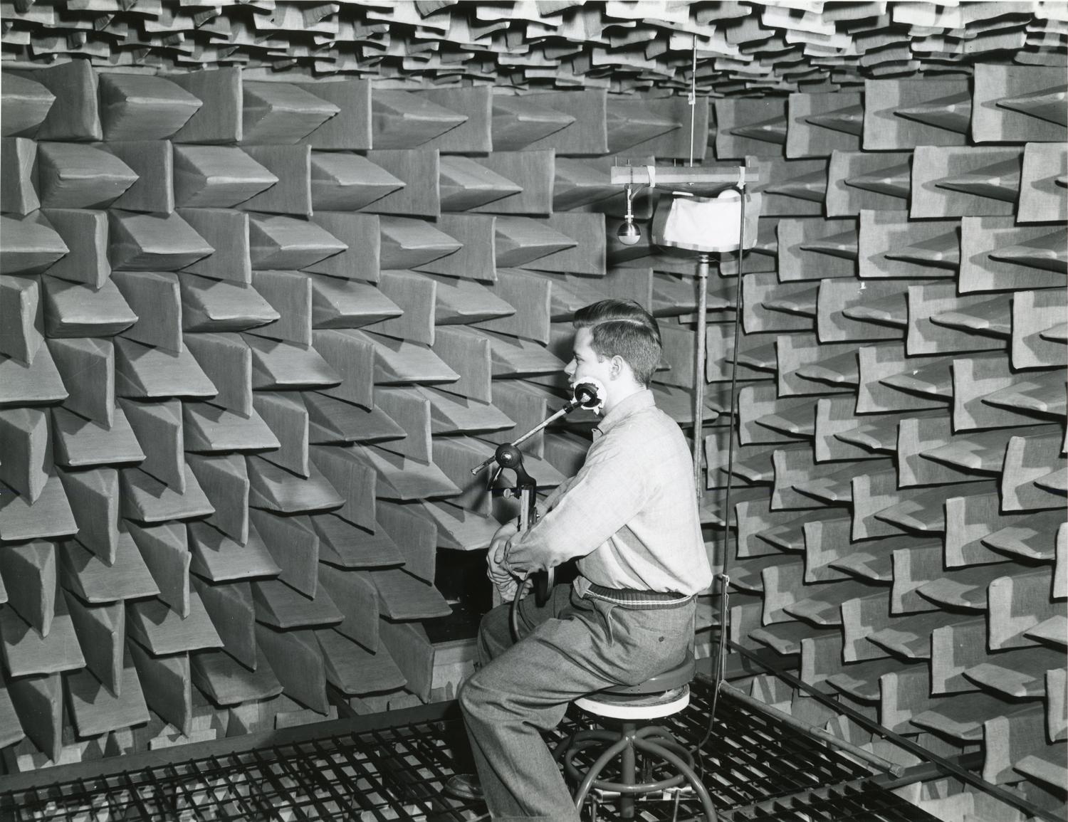 Photograph of an Illinois Tech student in an anechoic chamber at the Parmly Sound Laboratory. From press release attached to photograph: "Illinois Tech student, Jack Kiser, takes part in binaural hearing experiment at the Parmly Foundation for Auditory Research. Kiser is listening to two ... Show morePhotograph of an Illinois Tech student in an anechoic chamber at the Parmly Sound Laboratory. From press release attached to photograph: "Illinois Tech student, Jack Kiser, takes part in binaural hearing experiment at the Parmly Foundation for Auditory Research. Kiser is listening to two different tones in the completely silent (anechoic) chamber in order to determine their direction. Physicists at the Armour Research Foundation of Illinois Tech also use the Parmly chamber for acoustical research." Photographer unknown. Date of photograph unknown. Date range listed is approximate. Show less
