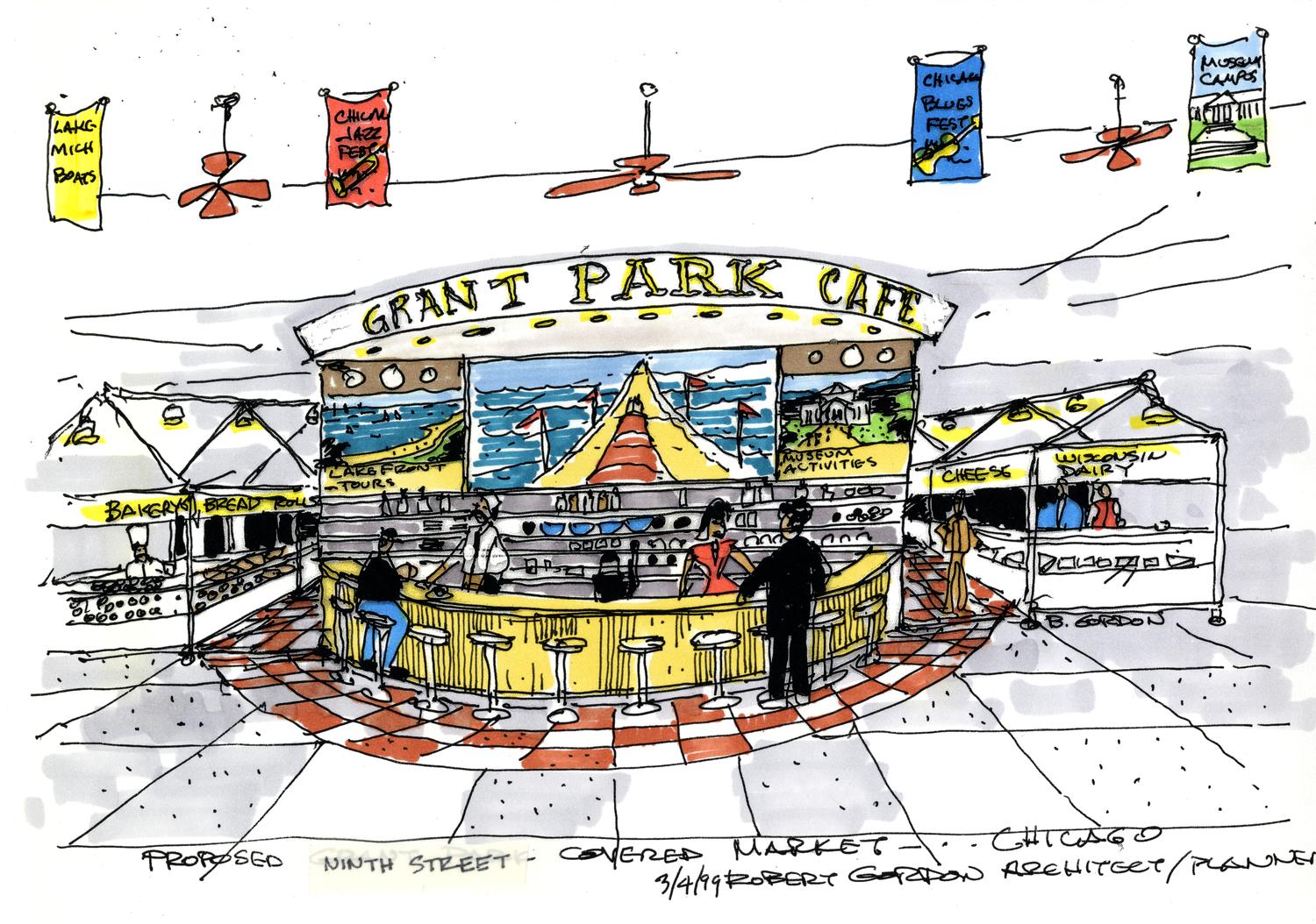 Full color architectural sketch of a proposed covered market at Ninth Street in Grant Park designed by Robert Gordon.