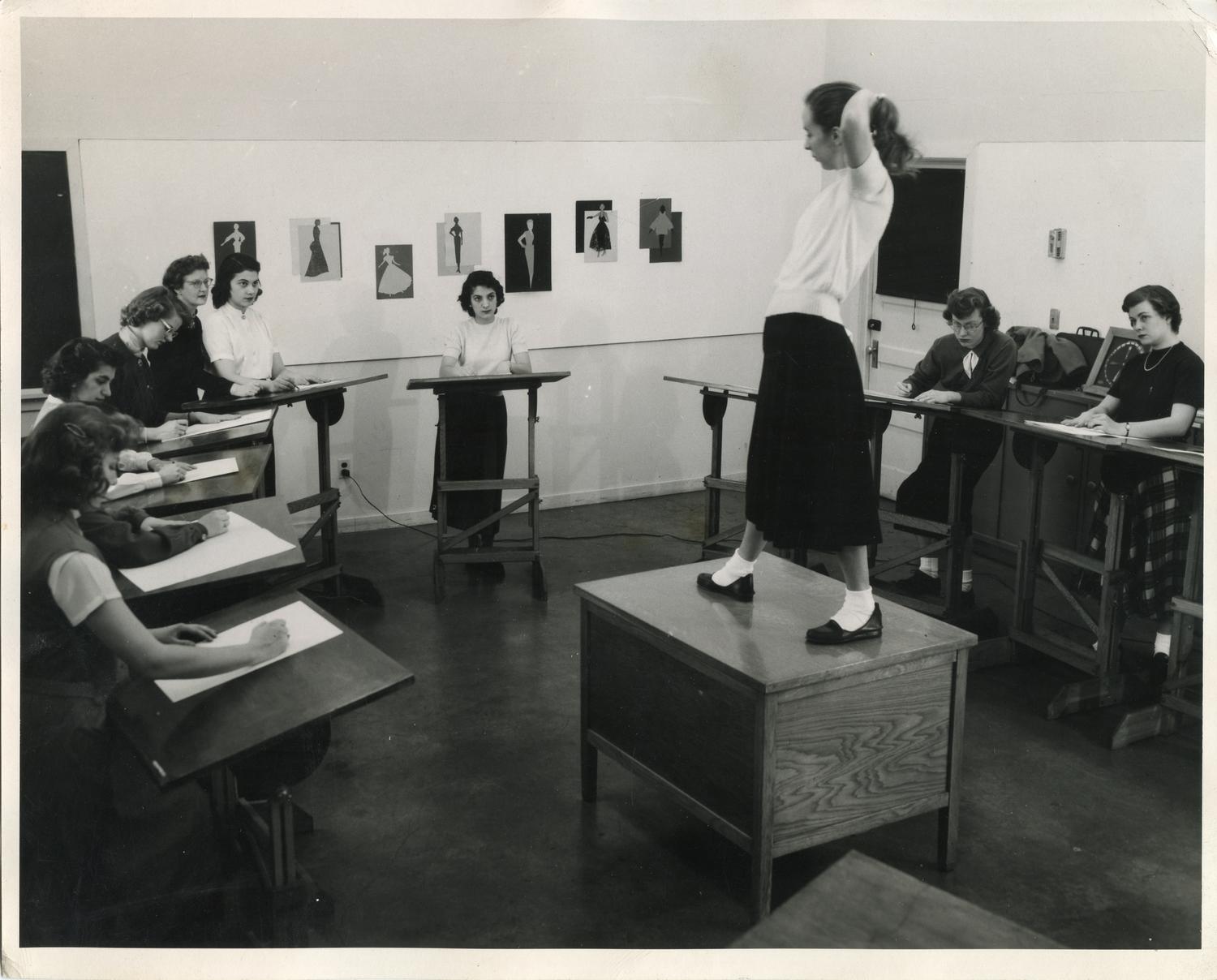 Photograph of a model and students in a costume design class. Date of photograph is unknown. Date range listed is approximate.
