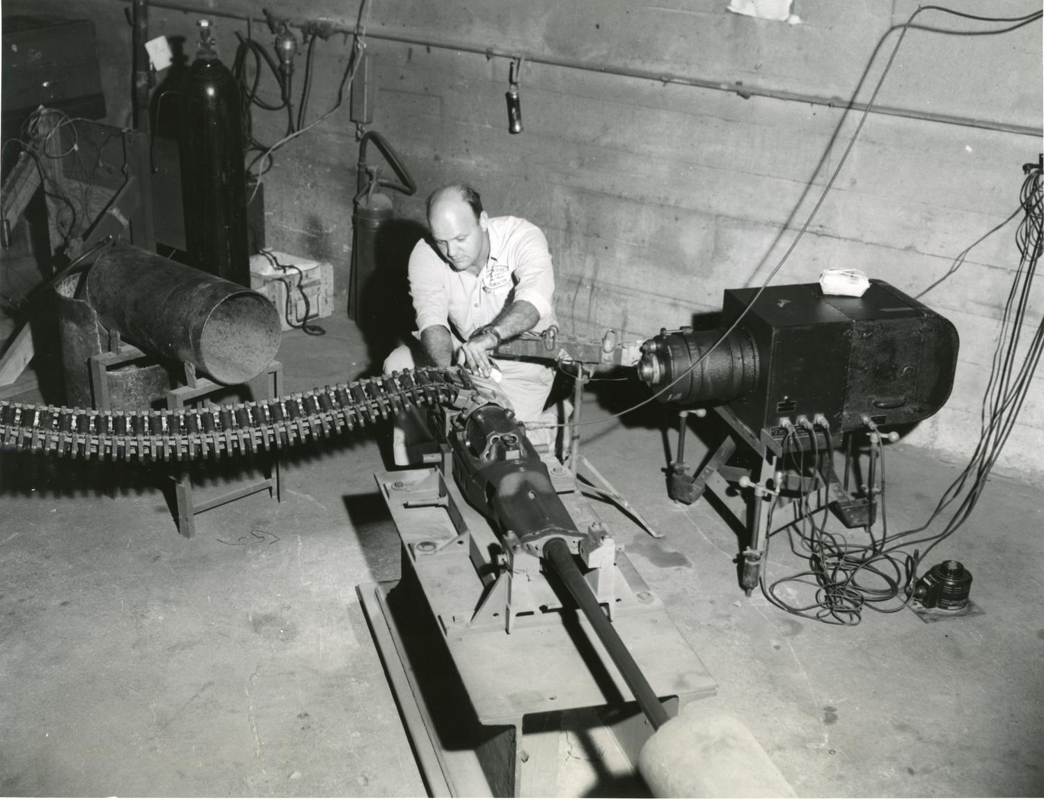 From the attached press release: "Fastest-firing single-barrel cannon, the M39 revolver-type weapon, is fed a ribbon of 20 mm ammunition by Grant Wantling, associate engineer at Armour Research... Show moreFrom the attached press release: "Fastest-firing single-barrel cannon, the M39 revolver-type weapon, is fed a ribbon of 20 mm ammunition by Grant Wantling, associate engineer at Armour Research Foundation of Illinois Institute of Technology. The cannon, currently used on jet warplanes, is the result of eight years intensive research by ARF, the government, and industrial concerns." Photographer unknown. Date of photograph unknown. Date range listed is approximate. Show less