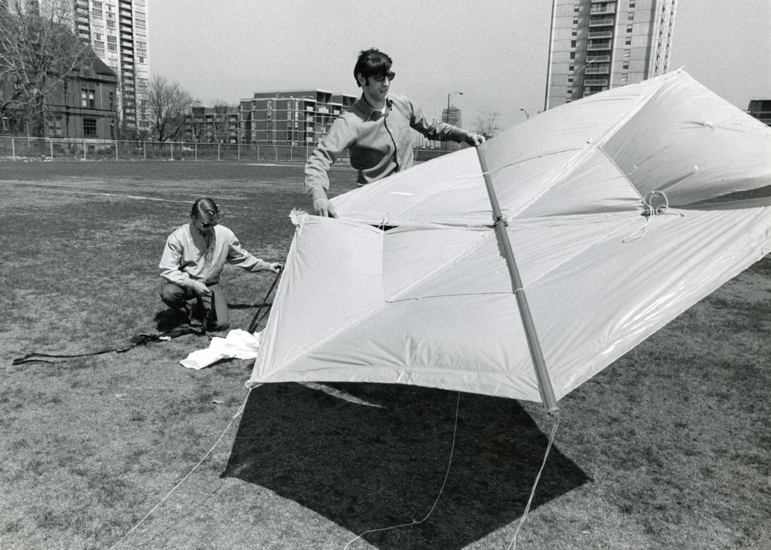 Photograph of students with a kite, likely made for the Amelia Earhart Kite Flying Contest (also known as the Kite Fly), an annual event sponsored by WIIT (later WOUI), the campus radio station.... Show morePhotograph of students with a kite, likely made for the Amelia Earhart Kite Flying Contest (also known as the Kite Fly), an annual event sponsored by WIIT (later WOUI), the campus radio station. The first Kite Fly occurred in April, 1971. Photographer unknown. Date of photograph is unknown. Date range listed is approximate. Show less