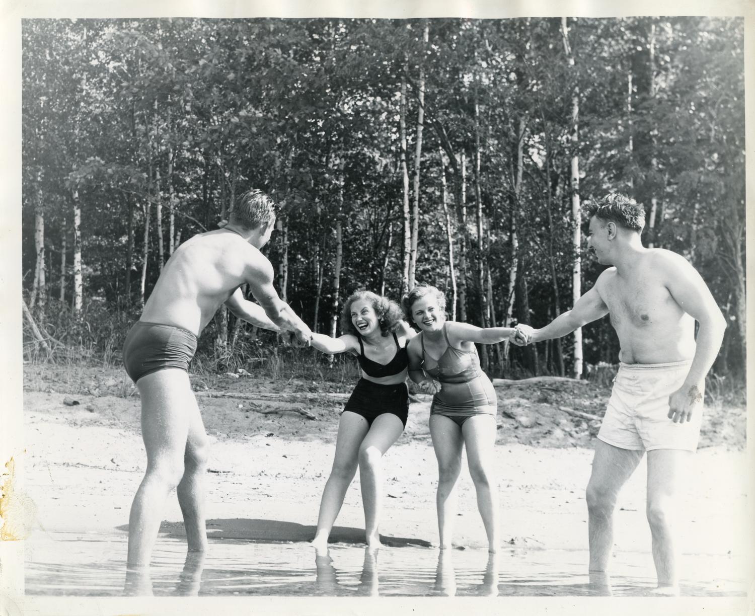 Photograph of Civil Engineering students at Camp Armour on Upper Trout Lake near Boulder Junction, Wisconsin. From attached caption: "Although they put in a stiff 8-hour day in the field, all is... Show morePhotograph of Civil Engineering students at Camp Armour on Upper Trout Lake near Boulder Junction, Wisconsin. From attached caption: "Although they put in a stiff 8-hour day in the field, all is not work for the two coeds attending the summer surveying course at the northern Wisconsin camp operated each summer by Illinois Institute of Technology. Here, Shirley Schultz, 19, right, and Madge Rosenbaum, 18, left, are urged to go for a dip in cool Upper Trout Lake, 400 miles north of Chicago, where Illinois Tech each summer maintains a lodge and cabins for its civil engineering students who are required to take a field course in surveying. Miss Schultz, a junior at Illinois Tech, and Miss Rosenbaum, a sophomore at Massachusetts Institute of Technology, are the first coeds in 40 years to attend the camp which closes September 3. Their swimming partners are, left, Kirkby Strickland, sophomore, 1754 East 79th street, and, right, Guido J. Norini, senior, 1887 North Winnebago street, both of Chicago. Miss Schultz, daughter of Mr. and Mrs. Louis Schultz, lives at 3447 North Oak Park Avenue, and Miss Rosembaum, daughter of Mr. and Mrs. Paul Rosembaum, 5461 Everett avenue." Photographer unknown. Show less
