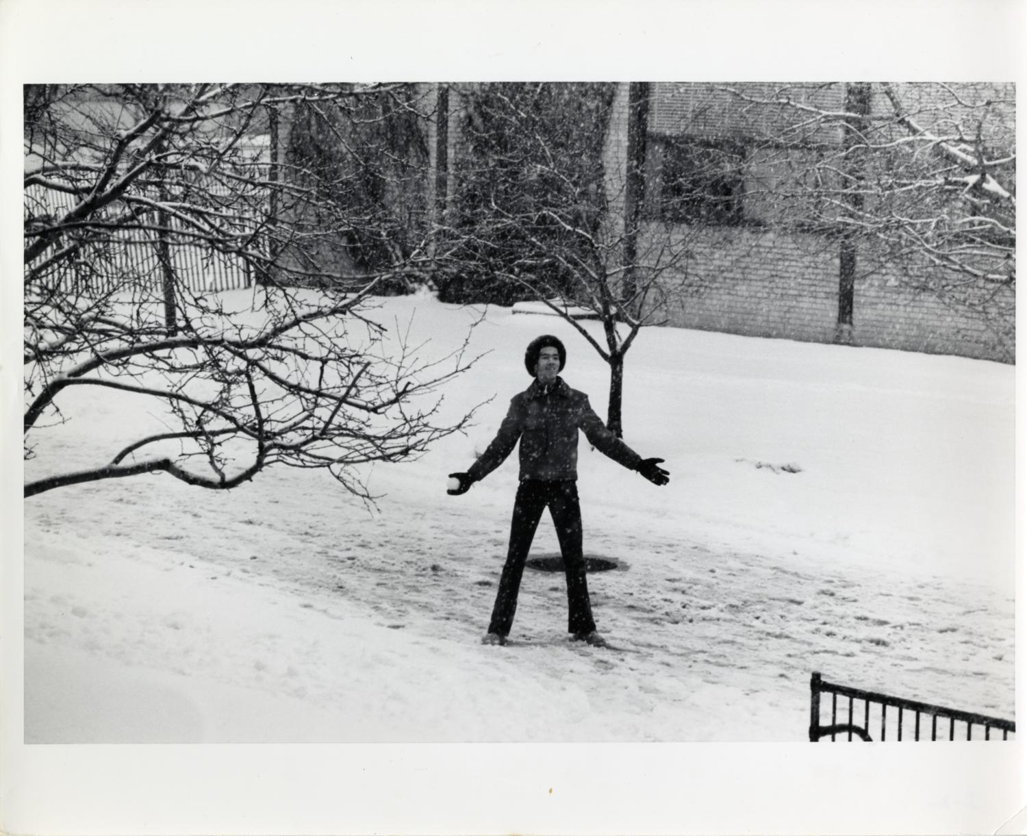 Student holding a snowball, Illinois Institute of Technology, Chicago, Illinois, ca. 1980s