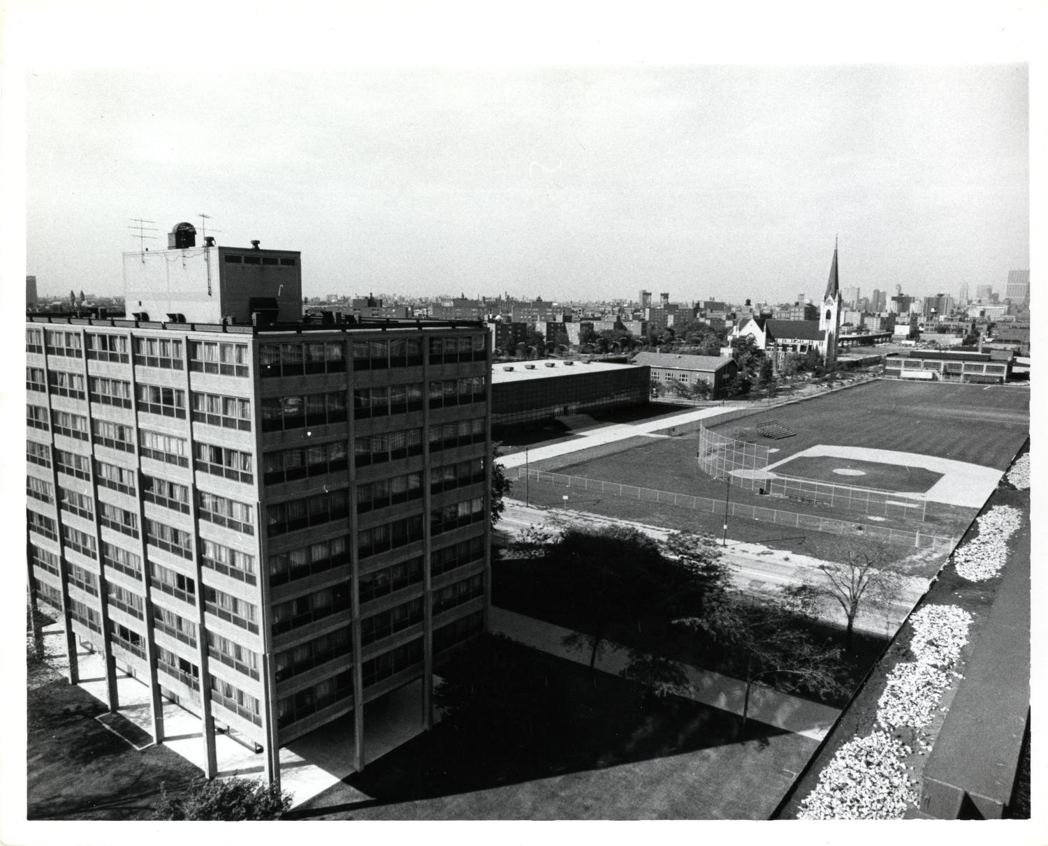 Photograph of Bailey Hall (now George J. Kacek Hall), likely photographed from Cunningham Hall, with Keating Hall and the baseball field visible to the north. Photographer unknown. Date of photograph is unknown. Date range listed is approximate.
