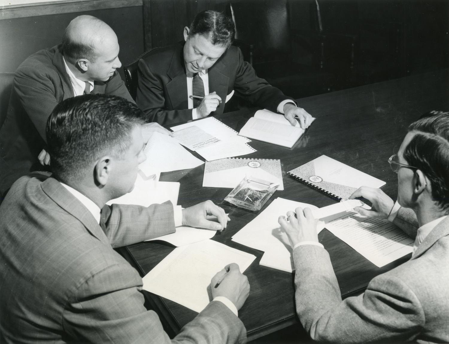From the attached caption: "Engineering economics study group at Armour Research Foundation of Illinois Institute of Technology, Chicago, considers a problem in the profitability of new production... Show moreFrom the attached caption: "Engineering economics study group at Armour Research Foundation of Illinois Institute of Technology, Chicago, considers a problem in the profitability of new production facilities. Clockwise are Raymond A. Erickson, supervisor of engineering economics, Harvey E. Glaess, associate chemist, John D. Keane, assistant supervisor of chemical engineering, and Richard H. Snow, research fellow." Photographer unknown. Date of photograph is unknown. Date range listed is approximate. Show less