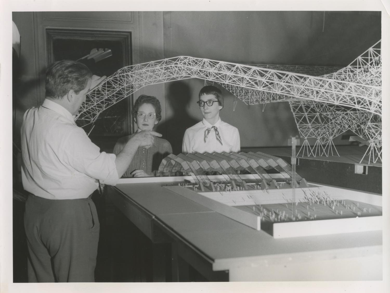 From attached caption: "Konrad Wachsmann, professor of advanced building research at the Institute of Design of Illinois Institute of Technology, Chicago, explains principles of space-frame... Show moreFrom attached caption: "Konrad Wachsmann, professor of advanced building research at the Institute of Design of Illinois Institute of Technology, Chicago, explains principles of space-frame construction to students Maurene Strug and Shirley Courtois. A model of an open-air music shelter, designed b y an Illinois Tech graduate student for his master's thesis, and based on space-frame construction, is shown on the table." Photographer unknown. Date of photograph is unknown. Date range listed is approximate. Show less