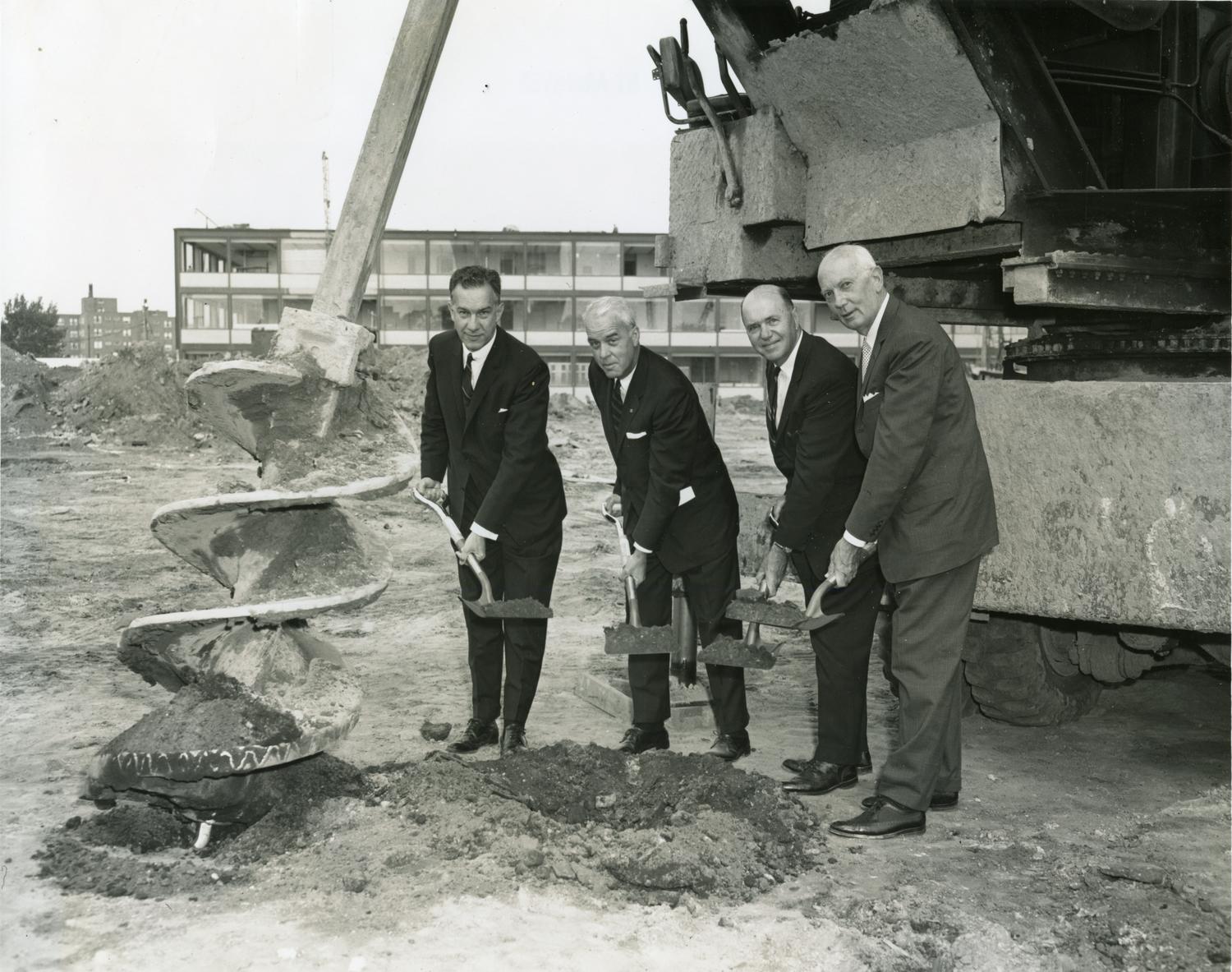 Photograph of the groundbreaking ceremony for the Engineering building known as Engineering 1 from its construction until 2015, now known as John T. Rettaliata Engineering Center. Pictured are Dr. John T. Rettaliata, Maynard P. Venema, Dr. Ralph G. Owens, and Axel A. Hofgren. Photographer unknown.