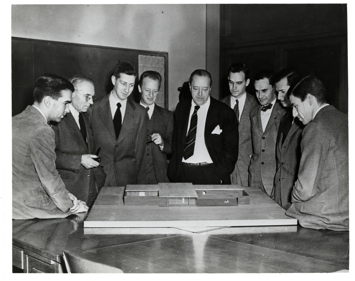 Photograph of the 1948 Illinois Institute of Technology Department of Architecture faculty. Left to right: George Danforth, Ludwig Hilberseimer, Thomas Burleigh, Alfred Caldwell, Ludwig Mies van... Show morePhotograph of the 1948 Illinois Institute of Technology Department of Architecture faculty. Left to right: George Danforth, Ludwig Hilberseimer, Thomas Burleigh, Alfred Caldwell, Ludwig Mies van der Rohe, Edward Duckett, Daniel Brenner, Earl Bluestein, A. James Speyer. Photographer unknown. Show less