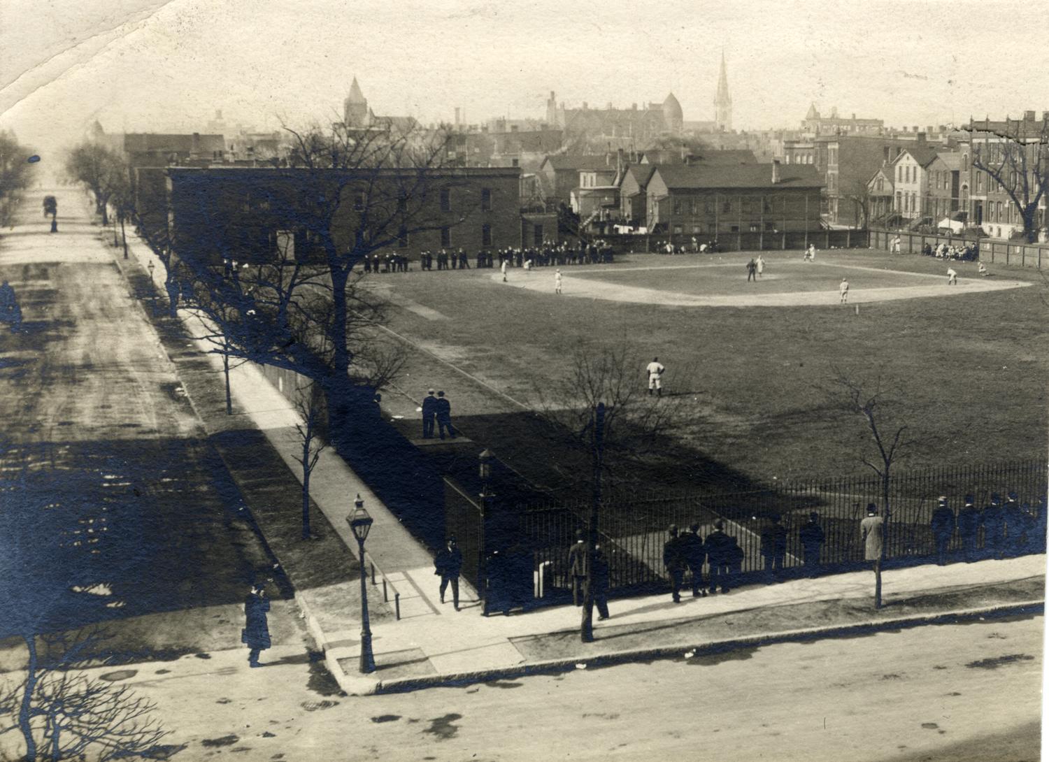 Photograph of a baseball game at Ogden Field on the Armour Institute of Technology campus, likely taken from the Armour Mission or Main Building at the corner of 33rd and Federal Streets. The building to the north of the field, a former residence, served as a cafeteria in the early 20th century... Show morePhotograph of a baseball game at Ogden Field on the Armour Institute of Technology campus, likely taken from the Armour Mission or Main Building at the corner of 33rd and Federal Streets. The building to the north of the field, a former residence, served as a cafeteria in the early 20th century before being converted to a fieldhouse in 1933, then an Armour Research Foundation magnetic recording laboratory in 1947. The building was demolished in 1956. Photographer unknown. Date of photograph is unknown. Date range listed is approximate. Show less