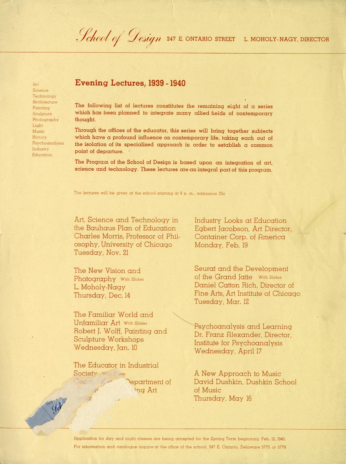 Flyer announcement of a portion of the 1939-1940 Evening Lecture series at the School of Design in Chicago, later to become the Institute of Design.
