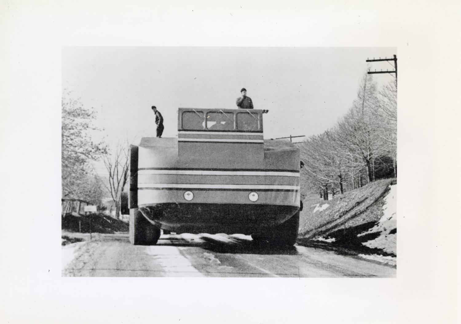 Photograph of the Armor Research Foundation's Antarctic Snow Cruiser on the Cherry Valley Turnpike east of Cazenovia, New York, during the trip between Chicago and the Boston Army Wharf, the Snow... Show morePhotograph of the Armor Research Foundation's Antarctic Snow Cruiser on the Cherry Valley Turnpike east of Cazenovia, New York, during the trip between Chicago and the Boston Army Wharf, the Snow Cruiser's departure point for Antarctica. The Snow Cruiser was designed by Armor Research Foundation Scientific Director Thomas C. Poulter, constructed by ARF, and taken on Richard Byrd's third Antarctic expedition. This photograph originally appeared as part of an advertisement for Economy Fuse and Manufacturing Co. in the December 1939 issue of the Armor Engineer and Alumnus. Photographer unknown. Show less