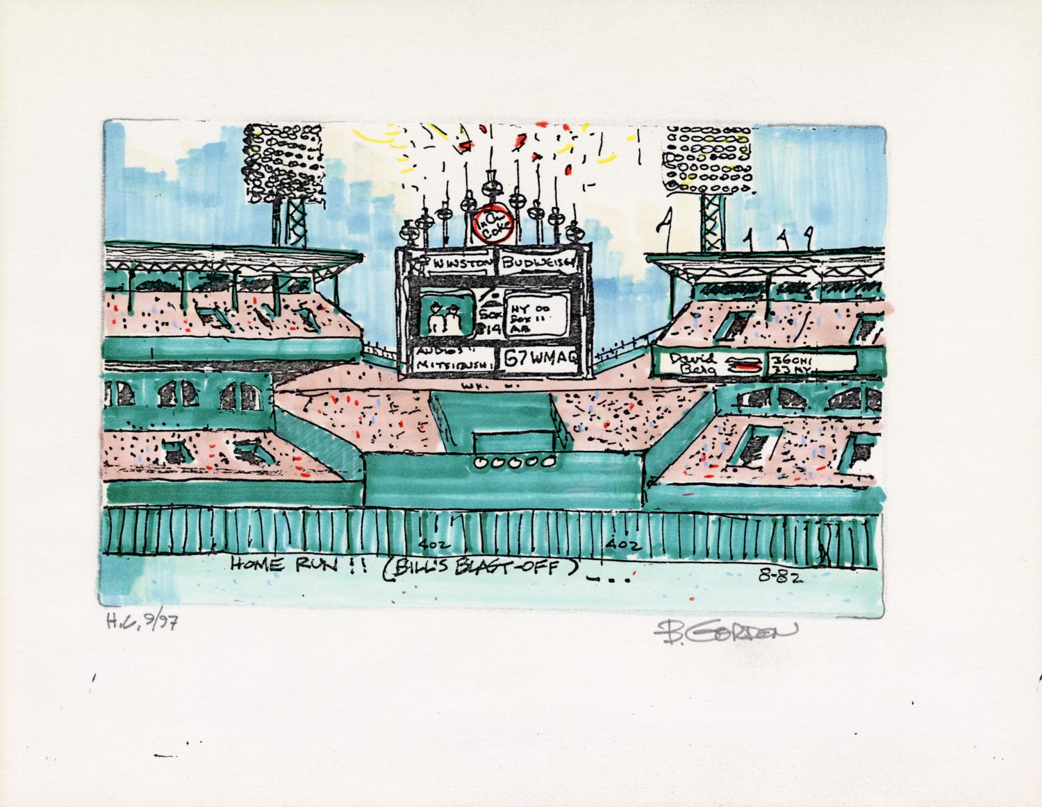 Hand-colored laser print of the outfield fence, bleachers, and scoreboard at Comiskey Park in Chicago. Drawn originally in August 1982, hand colored in September 1997.