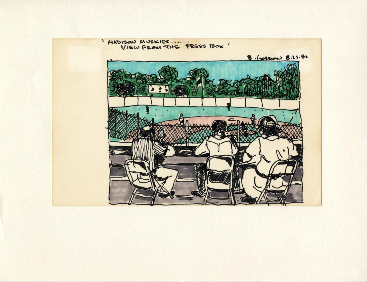Hand-colored laser print of the press box and playing field at a minor league baseball stadium (likely Breese Stevens Field) in Madison, Wisconsin.