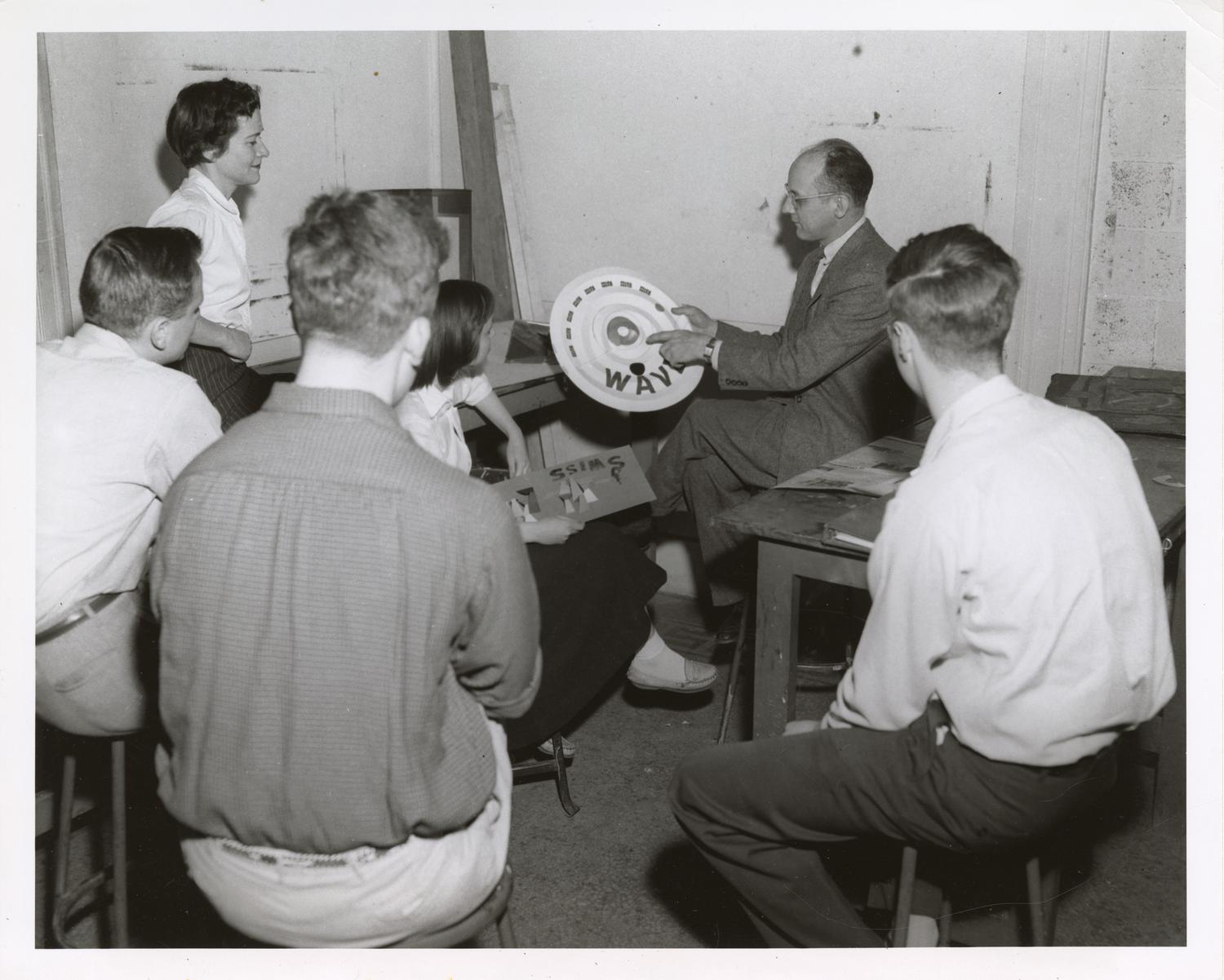 Photograph of Richard Koppe with Institute of Design students. From attached caption: "Students in the three-dimensional class at the Institute of Design of Illinois Institute of Design, Chicago,... Show morePhotograph of Richard Koppe with Institute of Design students. From attached caption: "Students in the three-dimensional class at the Institute of Design of Illinois Institute of Design, Chicago, listen to a critique of their work by Richard Koppe, head of the visual design section." Koppe, who studied at the New Bauhaus, taught at the Institute of Design from 1945-1963. Photographer unknown. Date of photograph unknown. Date range listed is approximate. Show less
