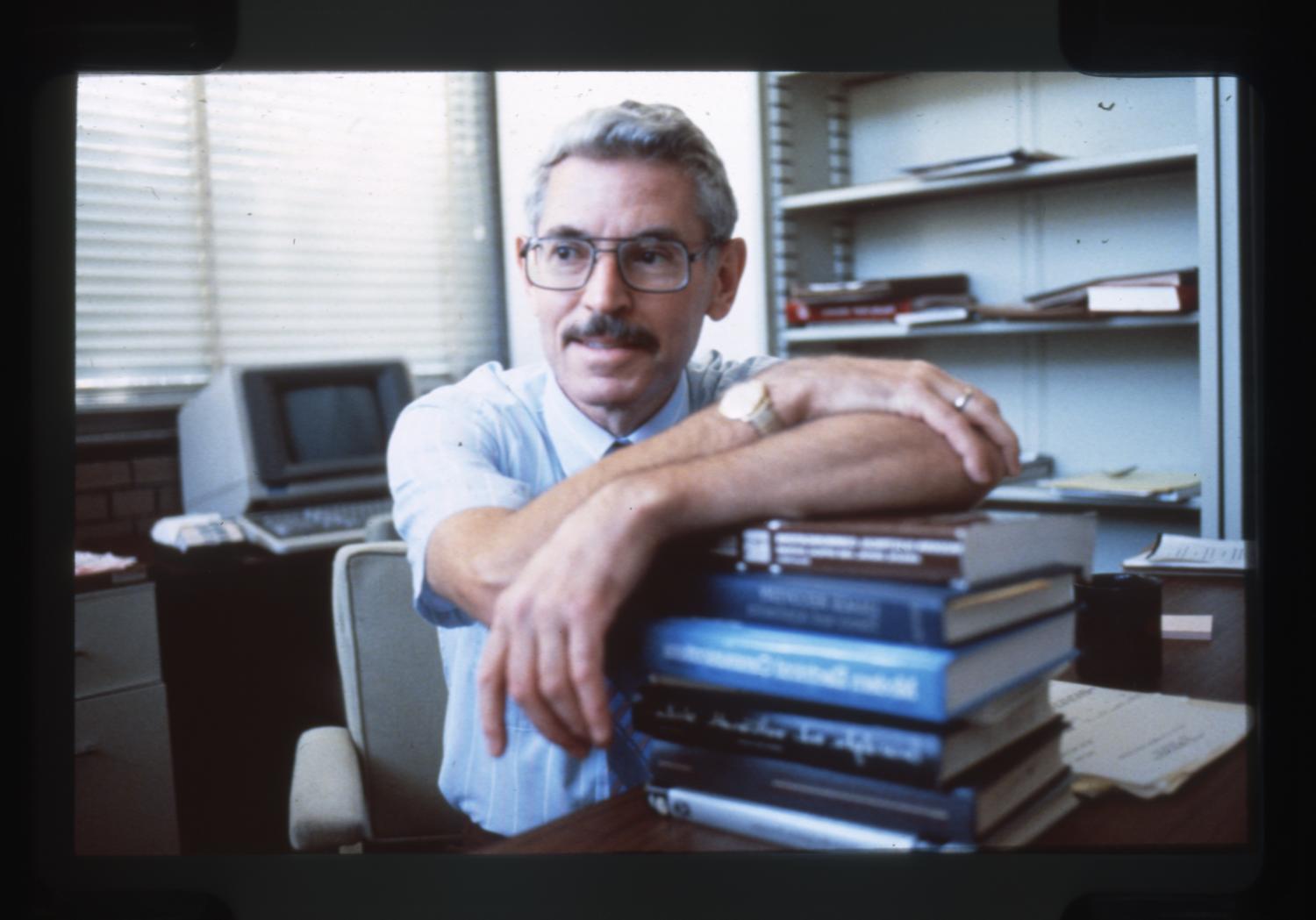 Color slide depicting Dr. Henry Stark, Carl and Paul Bodine Distinguished Professor of Electrical Engineering and Chairman of the Electrical and Computer Engineering department. Photographer unknown, possibly Dan Ryan. Date of photograph is unknown. Date range listed is approximate.