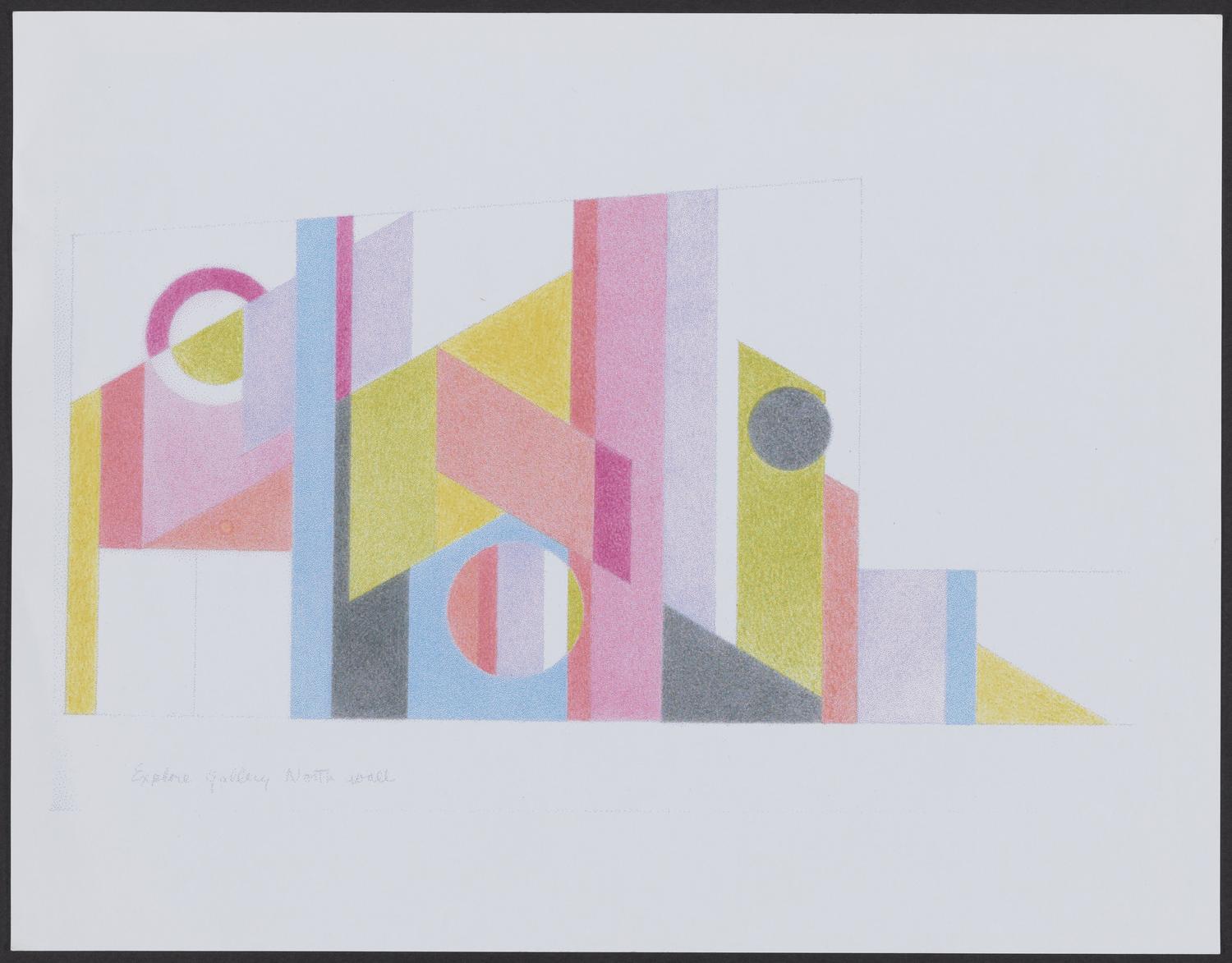 Drawing of the north wall section of No Limits, a 360-degree, walk-in mural designed by Mary Henry that was painted in the second floor gallery at the Bellevue Art Museum (now Bellevue Arts Museum) in 2001. Folder-level content description from Suzanne Rahn's inventory of the archive: "Folder... Show moreDrawing of the north wall section of No Limits, a 360-degree, walk-in mural designed by Mary Henry that was painted in the second floor gallery at the Bellevue Art Museum (now Bellevue Arts Museum) in 2001. Folder-level content description from Suzanne Rahn's inventory of the archive: "Folder containing announcement of overlapping exhibitions for the opening of the Bellevue Art Museum—her 'North Slope' paintings (never shown together before or since) filling an enormous space on the main floor and 'No Limits,' a 360-degree walk-in mural in the second floor gallery (now obliterated); designs for 'No Limits'; and a review in The Seattle Times." Show less