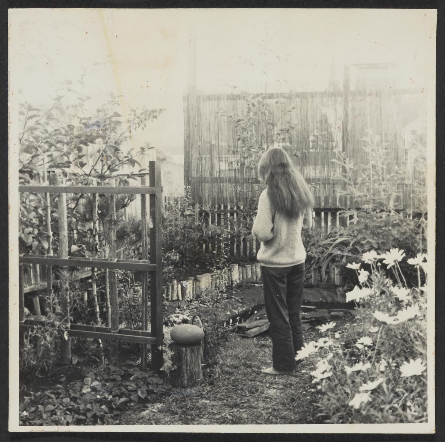 Mary Henry in her garden, Mendocino, California, ca. 1965-1969