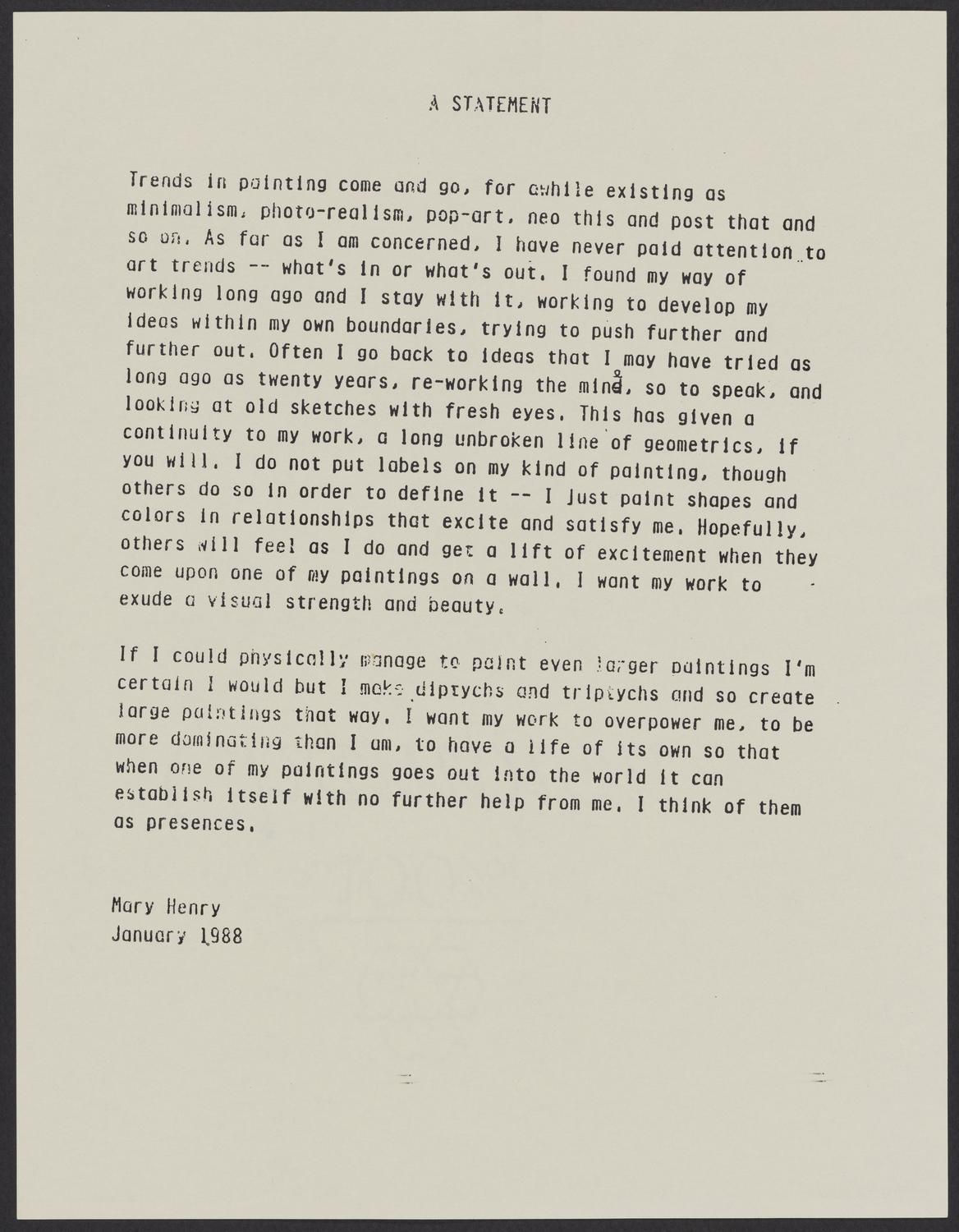 Typescript artist statement written by Mary Dill Henry in January, 1988. A Statement describes Henry's means of conceiving her geometric paintings and her thoughts on their size and impact.