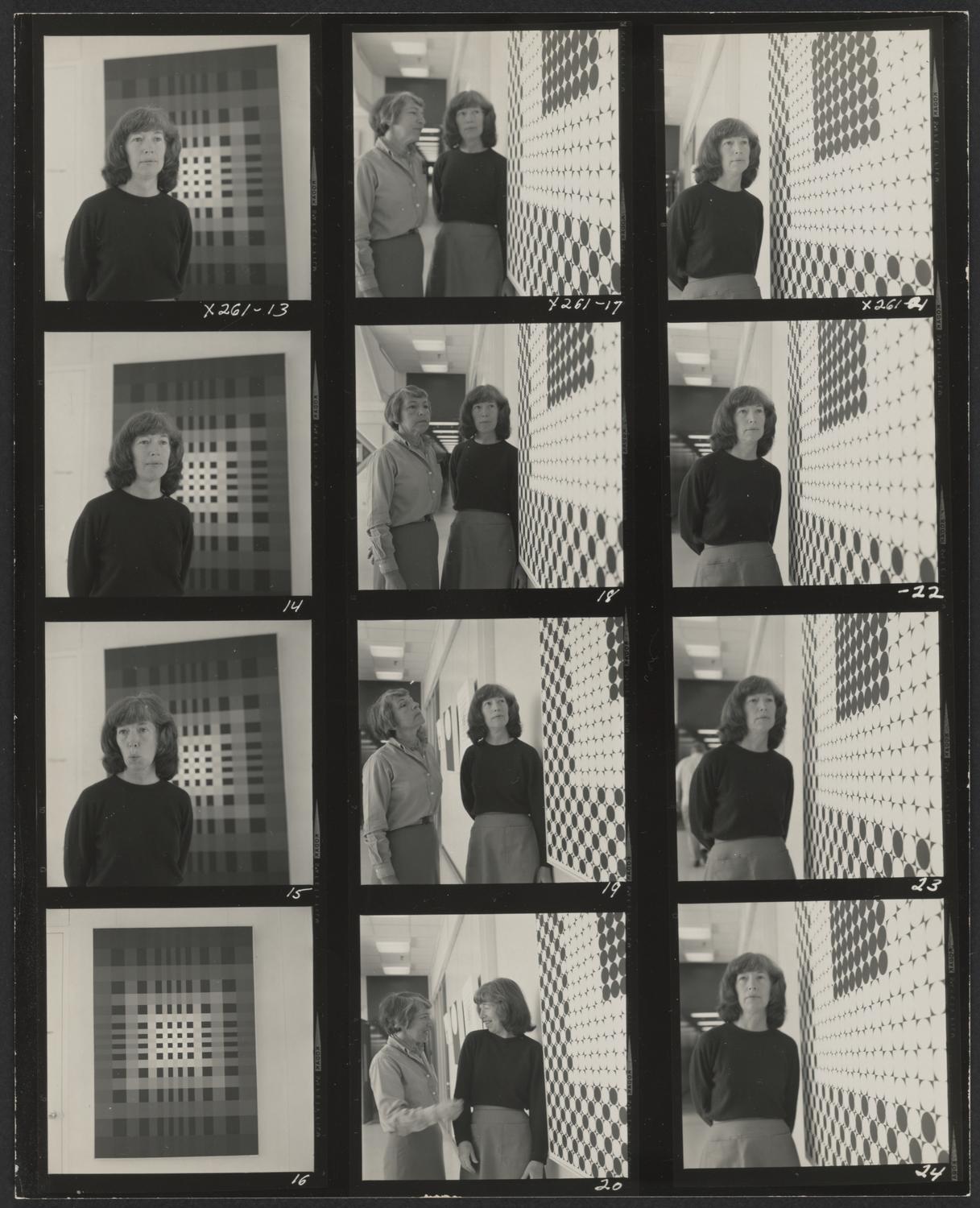 Contact sheet of photographs of Mary Henry and her paintings, with some photographs including Estelle Grunewald, artist and founder of Art to Industry, a business that attempted to connect artists... Show moreContact sheet of photographs of Mary Henry and her paintings, with some photographs including Estelle Grunewald, artist and founder of Art to Industry, a business that attempted to connect artists with corporate patrons. The photographs are likely from Henry's solo exhibition in 1967 at the Ampex Corporation in Redwood City, California. Verso of photograph contains a stamp with contact information for Art to Industry: "ART TO INDUSTRY / ESTELLE GRUNEWALD / 4261 RUTHELMA PALO ALTO CALIF 94308 / PHONE 325-4167." Photographer unknown. Date of photographs is unknown. Date range listed is approximate. Show less