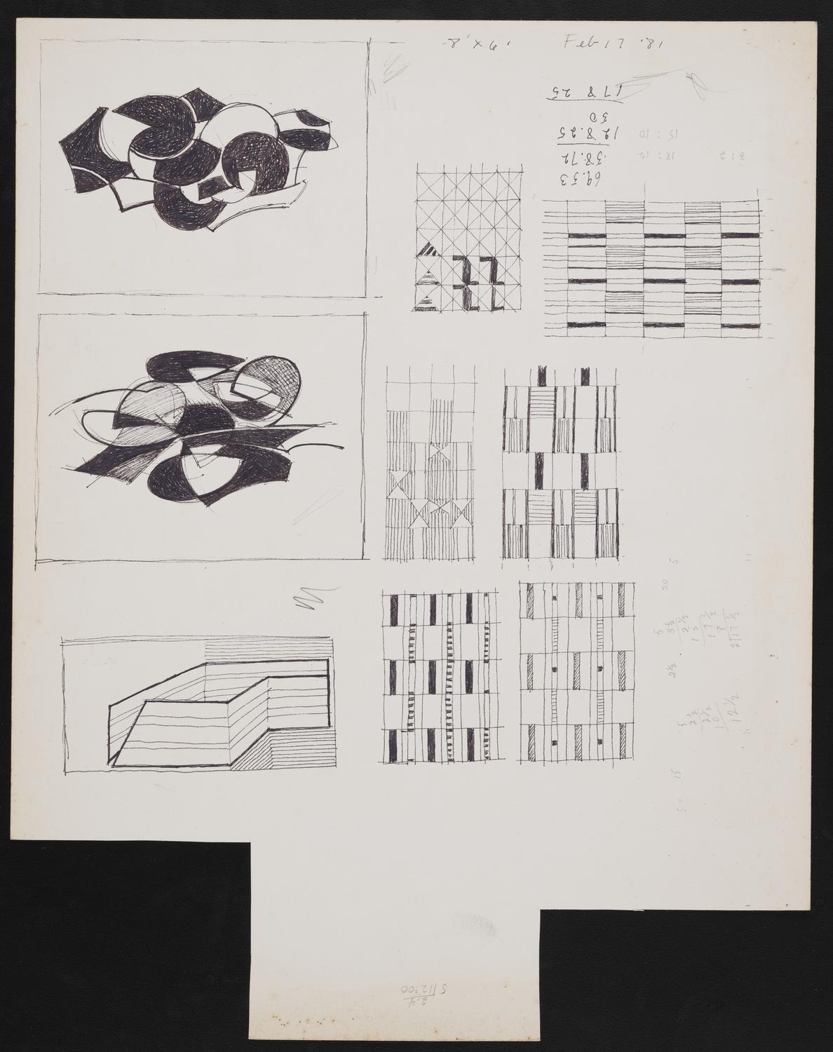 Untitled ink drawings by Mary Henry. Inscription on verso reads "8' x 6' Feb 17 81" and also contains what appear to be mathematical calculations.