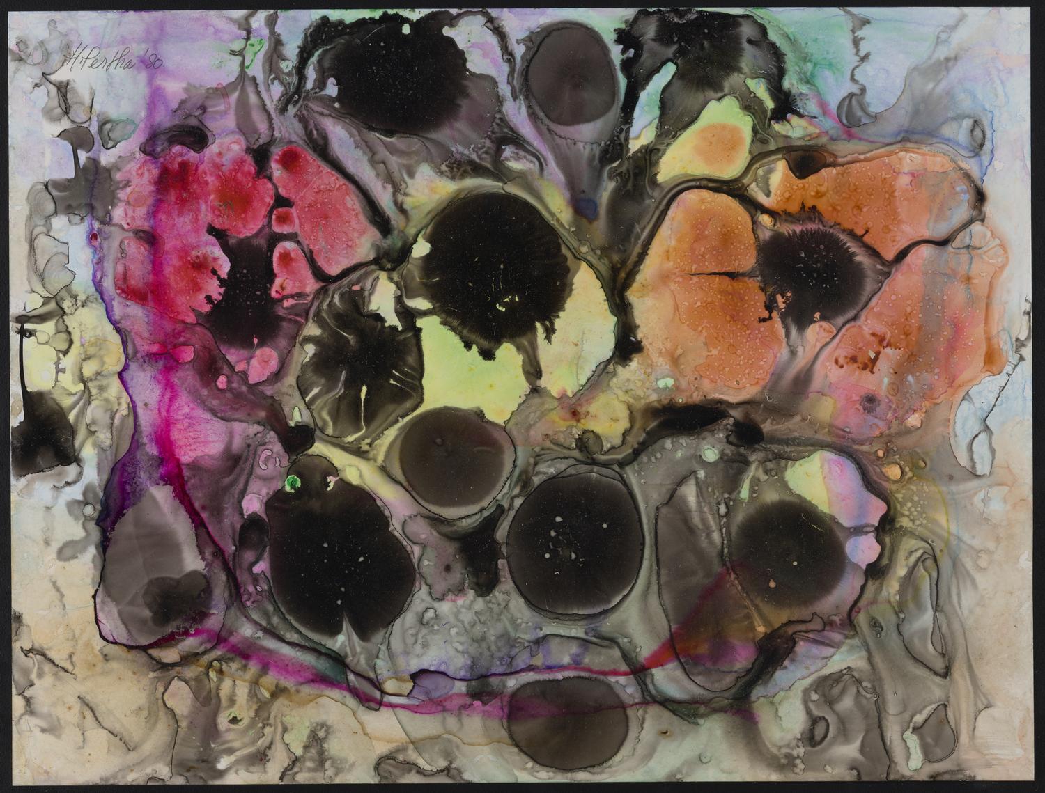 Tidal Blossom, an ink painting by Hilda Pertha. Pertha, who moved to Mendocino, California in 1979, was a friend of Mary Henry's, and likely gifted this painting to Henry.