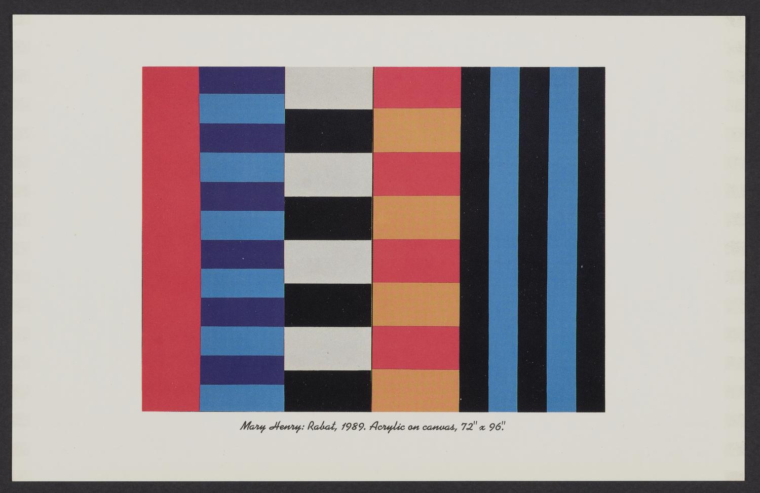 Exhibition annoucement postcard for Mary Henry's show New Constructs at Cliff Michel Gallery in Seattle, Washington, August 3-27, 1989. The recto of the card contains an image of Henry's painting... Show moreExhibition annoucement postcard for Mary Henry's show New Constructs at Cliff Michel Gallery in Seattle, Washington, August 3-27, 1989. The recto of the card contains an image of Henry's painting Rabat (1989), and the verso contains information about the exhibit, it's opening reception, and Henry's inclusion in the Bumberbiennale, a retrospective art show at the 1989 Bumbershoot Festival in Seattle. Show less