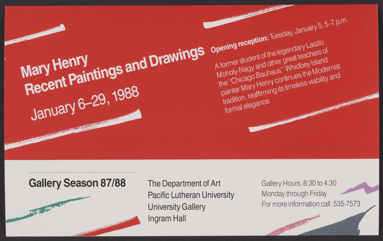 Exhibition announcement for Mary Henry's show Recent Paintings and Drawings at the University Gallery, Pacific Lutheran University, Tacoma, Washington, 1987-1988, recto