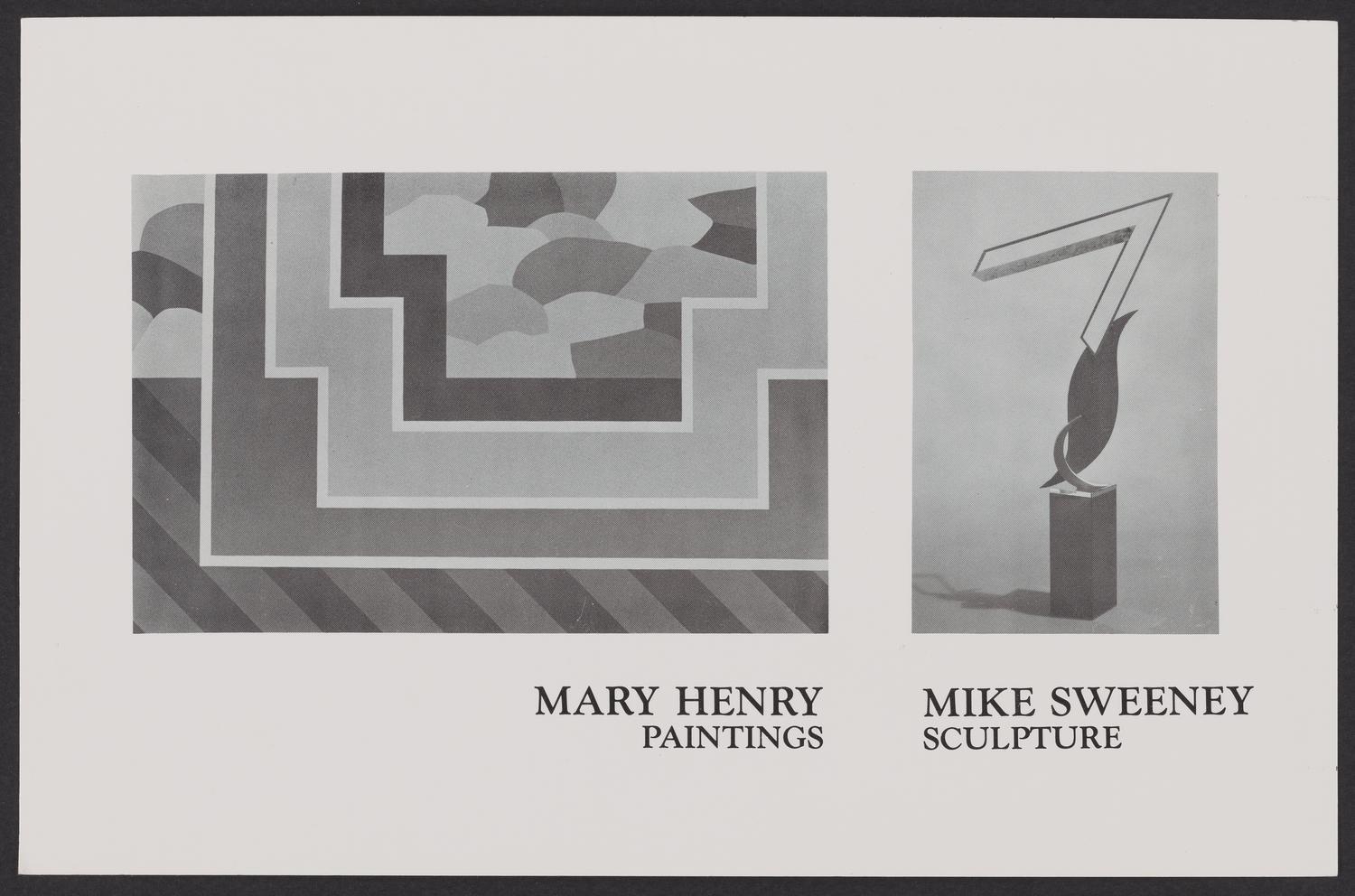 Exhibition annoucement postcard for an art exhibition pairing the paintings of Mary Henry with the sculptures of Mike Sweeney at Childers/Proctor Gallery, Langley, Washington, 1988. The recto... Show moreExhibition annoucement postcard for an art exhibition pairing the paintings of Mary Henry with the sculptures of Mike Sweeney at Childers/Proctor Gallery, Langley, Washington, 1988. The recto contains a detail of one of Mary Henry's paintings and an image of one of Mike Sweeney's sculptures. Show less