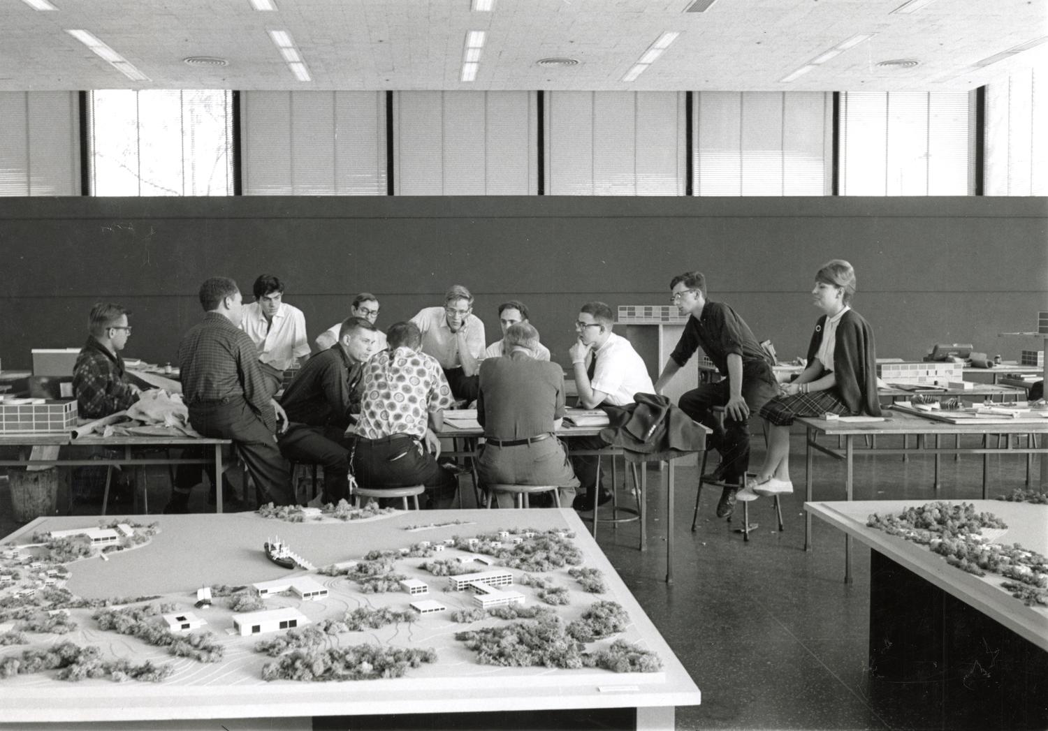 Students and models in S.R. Crown Hall, Illinois Institute of Technology, Chicago, Illinois, ca. 1962