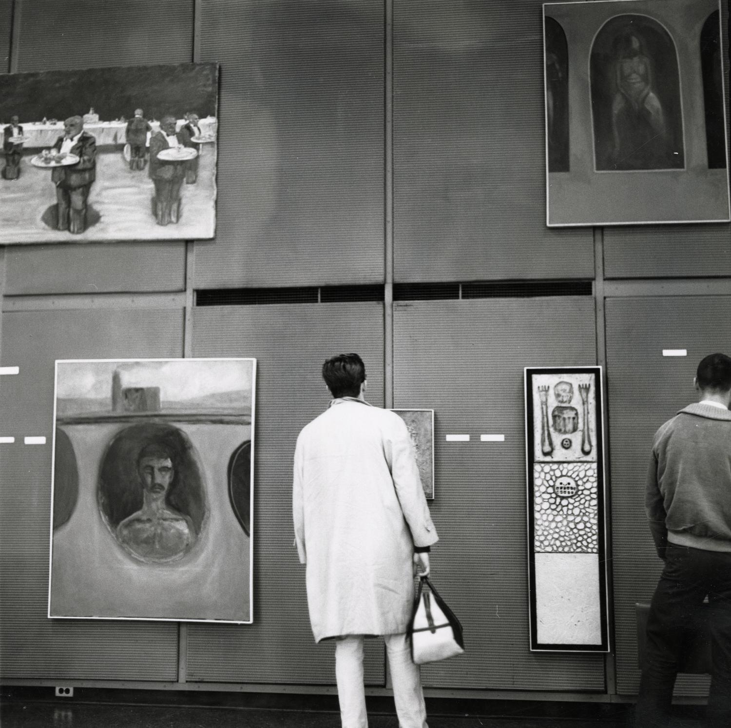 Students looking at paintings on exhibit, Illinois Institute of Technology, Chicago, Illinois, ca. 1964