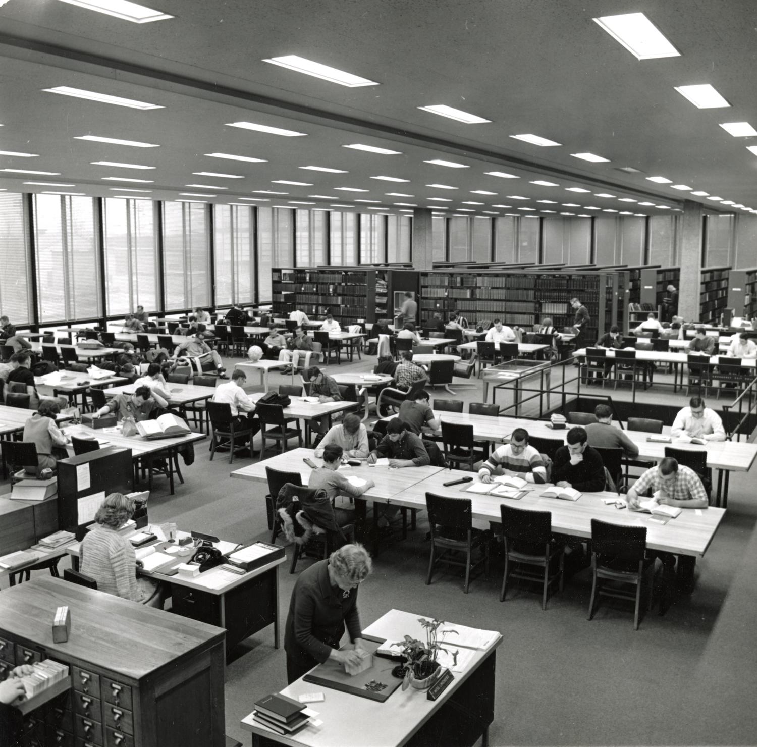 Photograph of students on the upper level of the recently opened John Crerar Library (now the Paul V. Galvin Library). Photographer unknown. Date of photograph unknown. Date range listed is approximate.