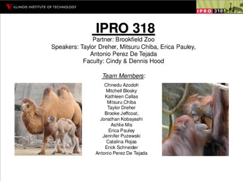 Do you love the zoo? Do you wish you could see all of the animals and learn about them too in just one easy visit? Our IPRO team is creating an iPhone application to do just that. We’re working with the Brookfield Zoo education staff and animal researchers to develop a guided inquiry process that... Show moreDo you love the zoo? Do you wish you could see all of the animals and learn about them too in just one easy visit? Our IPRO team is creating an iPhone application to do just that. We’re working with the Brookfield Zoo education staff and animal researchers to develop a guided inquiry process that will assist users in finding and identifying animals. Getting closer to an animal is a breeze. Because the animals’ locations are mapped, you can find them easily on foot or identify them by their color, pattern, and shape. Learn fun facts about any animal you choose while watching videos and scrolling through pictures. We’re working to create the best tour guide for the zoo that fits in your pocket.
