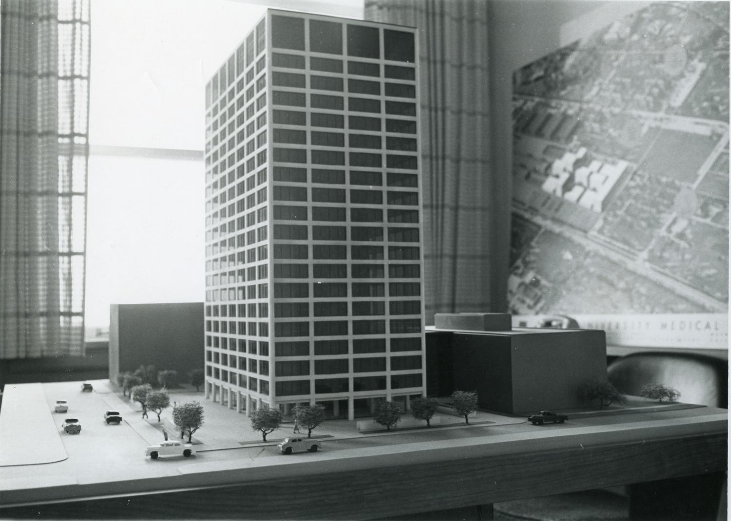 Photograph of a model of the IITRI Tower, designed by Schmidt, Garden, and Erikson and constructed in 1963-1964. The Tower is located at 10 West 35th Street. This 20-story tower houses the... Show morePhotograph of a model of the IITRI Tower, designed by Schmidt, Garden, and Erikson and constructed in 1963-1964. The Tower is located at 10 West 35th Street. This 20-story tower houses the university's administrative offices, as well as the headquarters of the IIT Research Institute. A variety of mixed-use tenants also lease space in the tower. Also known as: IIT Research Institute Tower (1964-ca. 2002). Show less