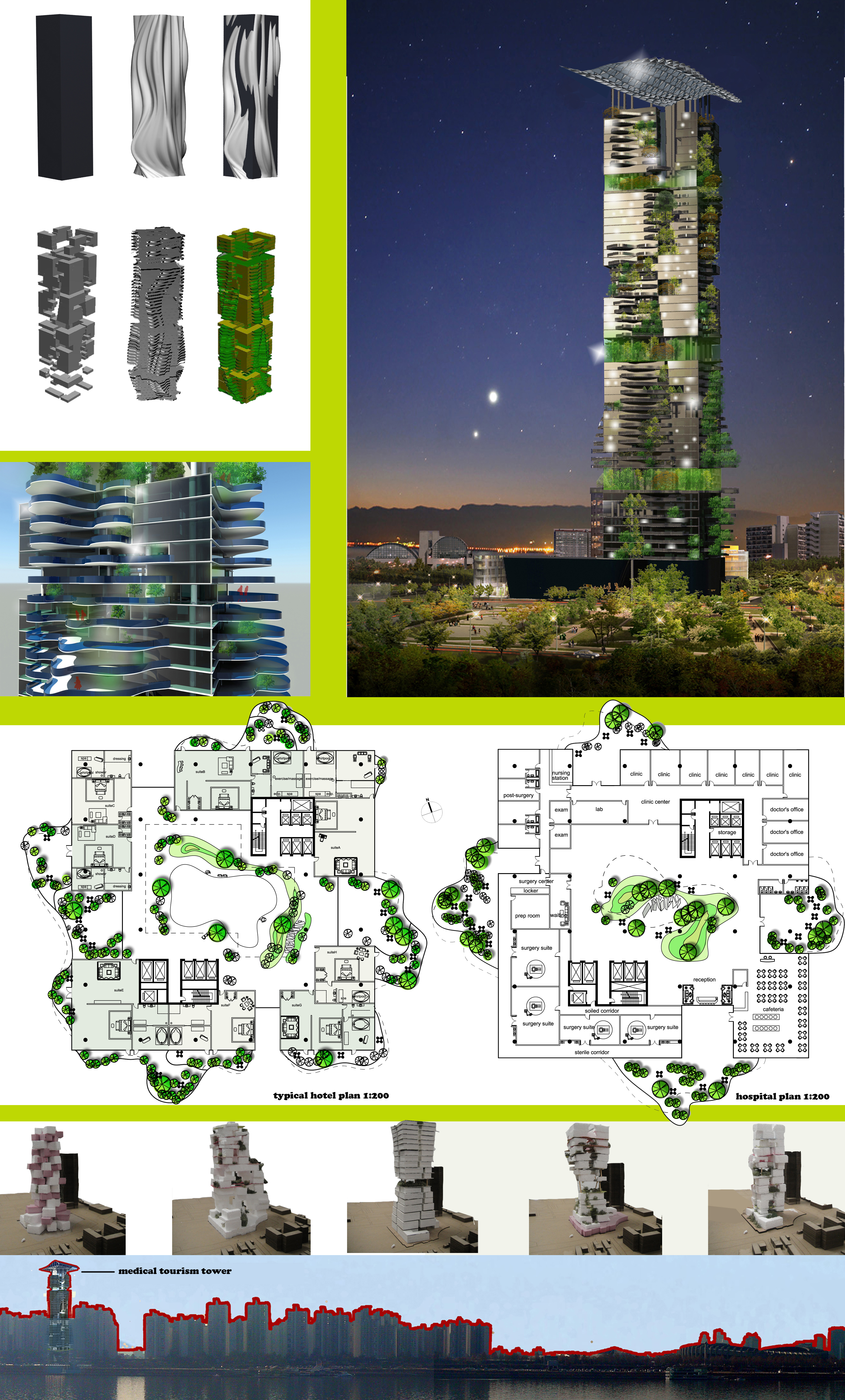This is the design of a medical tourism tower located in Seoul, Korea. It is a mixed-use high rise which includes three plastic surgery hospitals along with a luxury hotel.